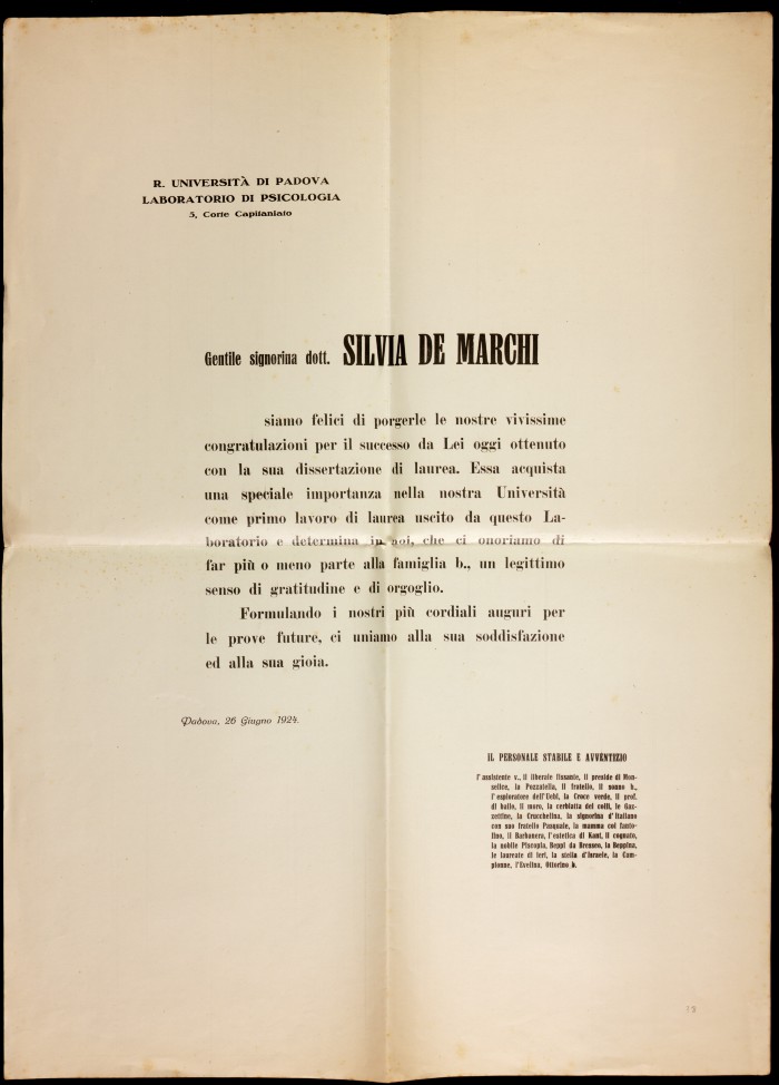 Il fascicolo contiene 2 copie del manifesto di congratulazioni dell’Università di Padova-Laboratorio di Psicologia a Silvia De Marchi in occasione della sua laurea (Padova, 26 giugno 1924).