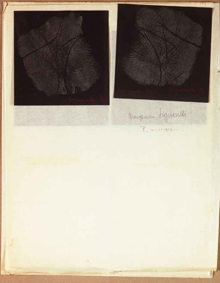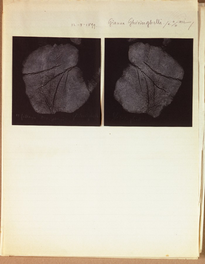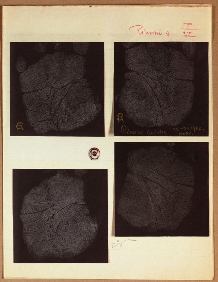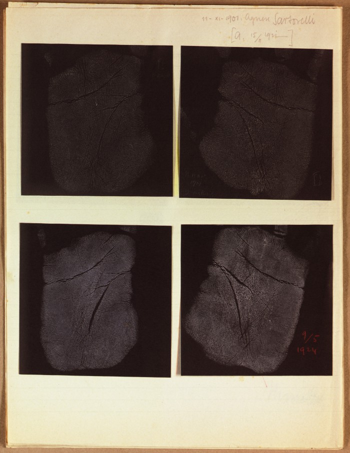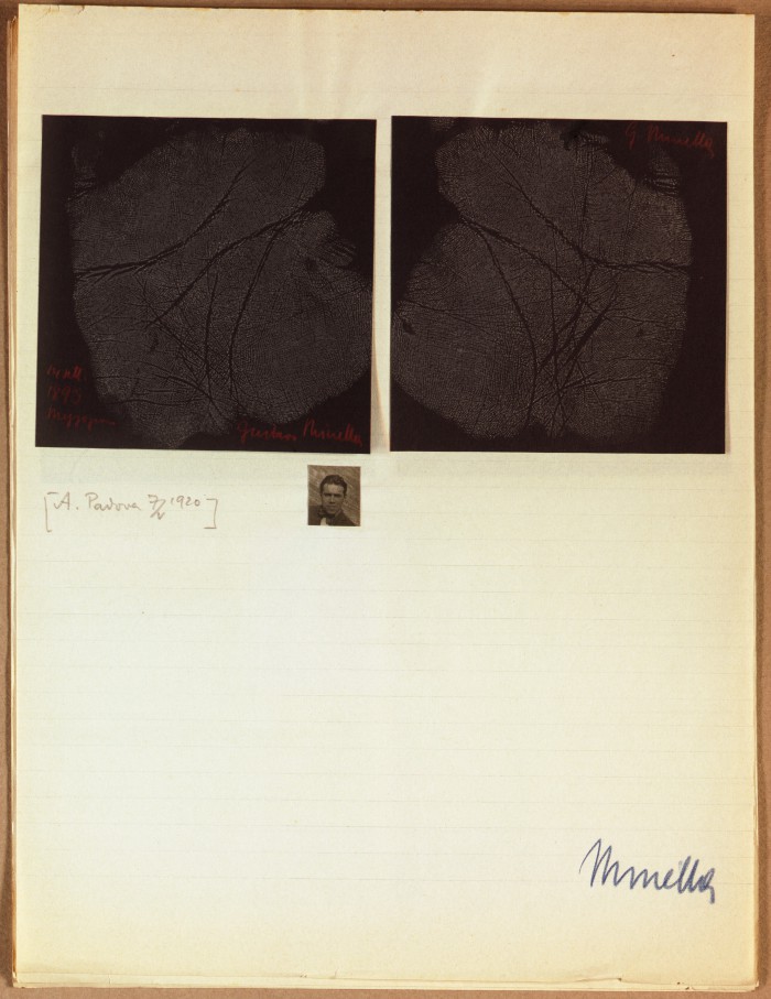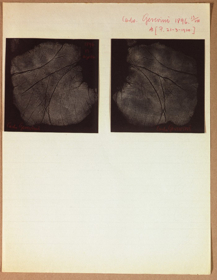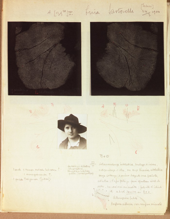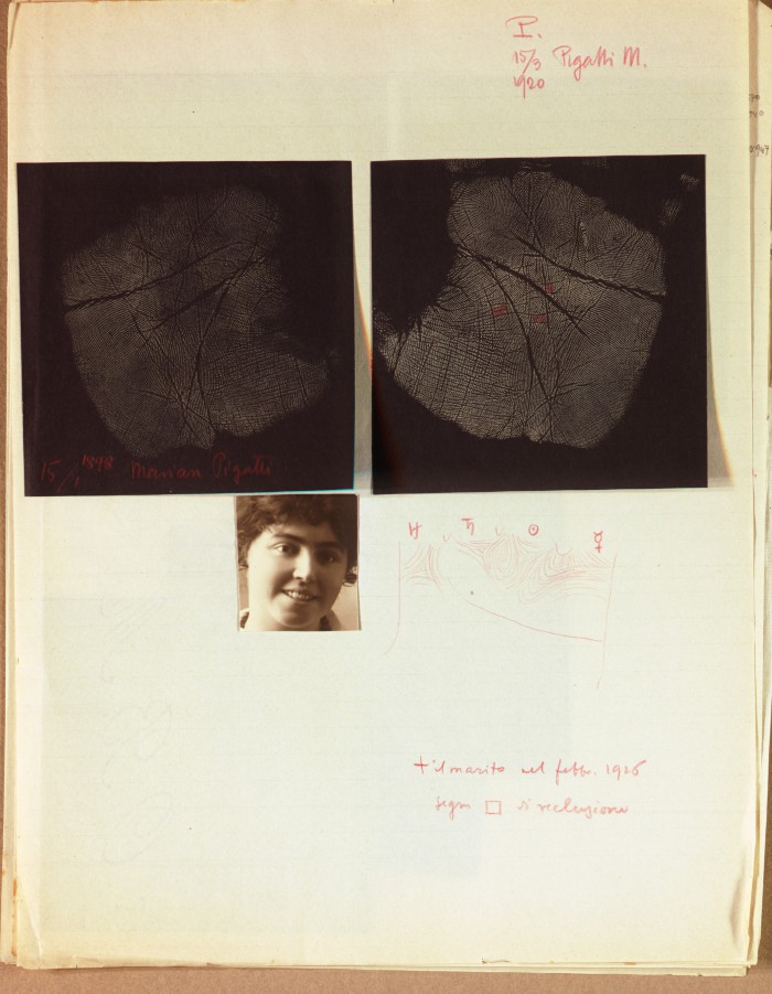 Il fascicolo comprende appunti sulla percezione integrale e diverse impronte palmari (con nominativo del soggetto e data dell’analisi). Di alcuni soggetti c’è anche la fotografia.