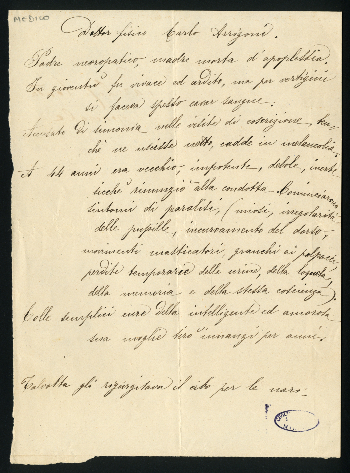 5) Arrigoni Carlo, 44 anni, dottor fisico: breve anamnesi. Paralisi lenta generale o senilità precoce.