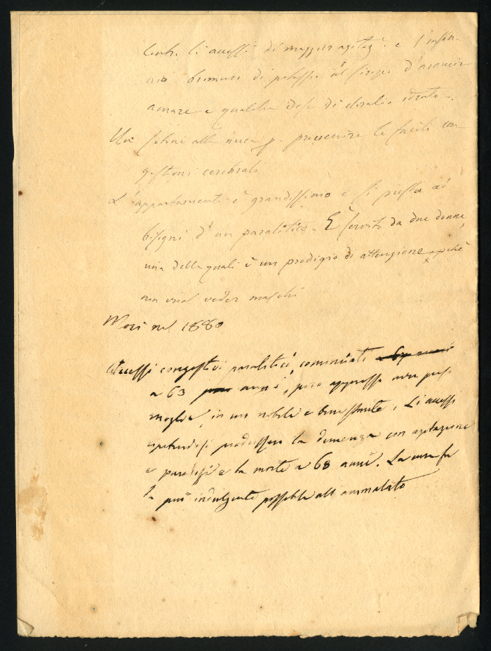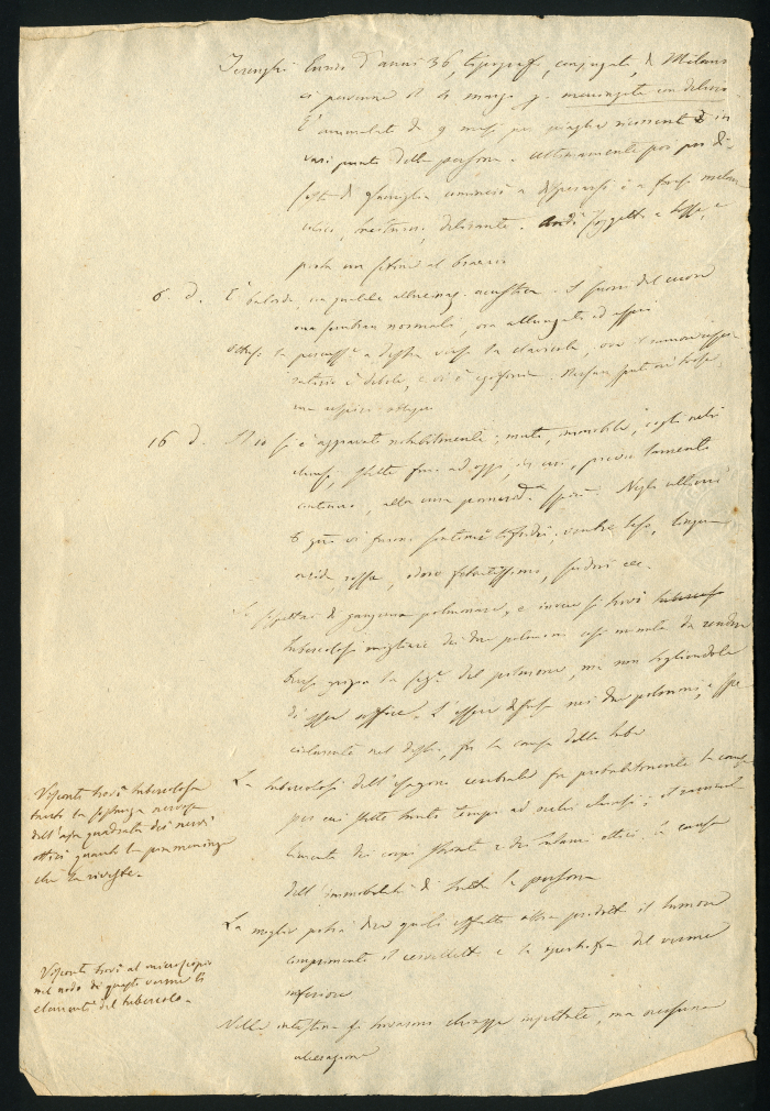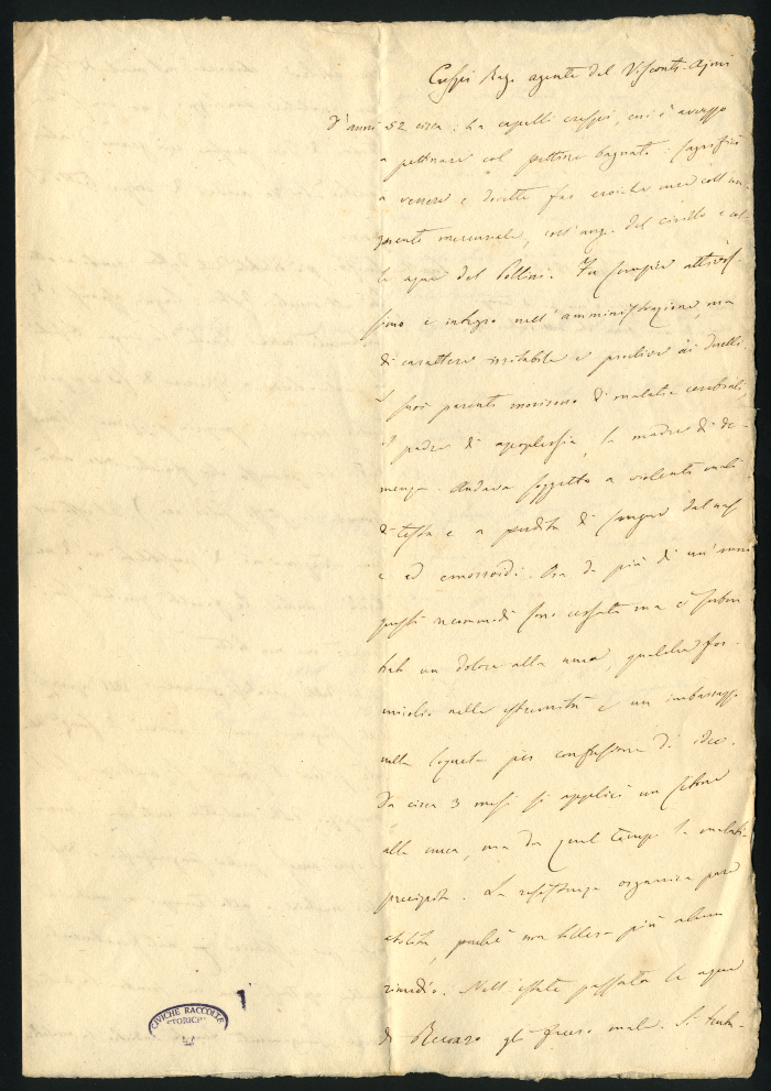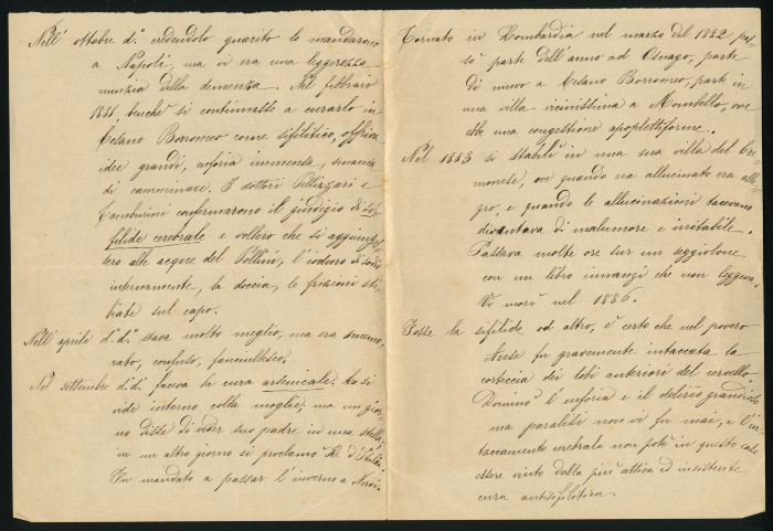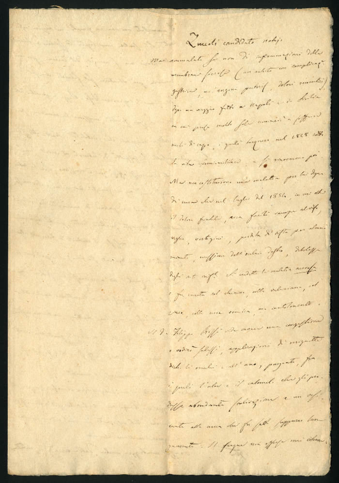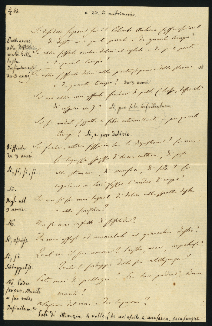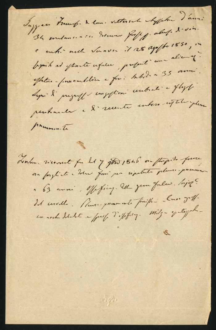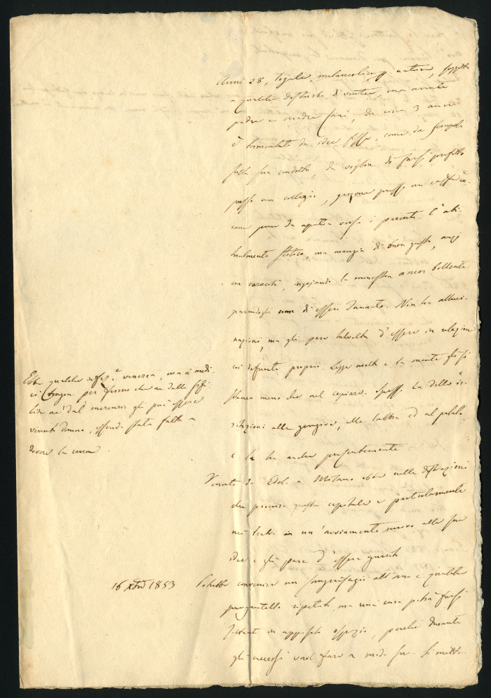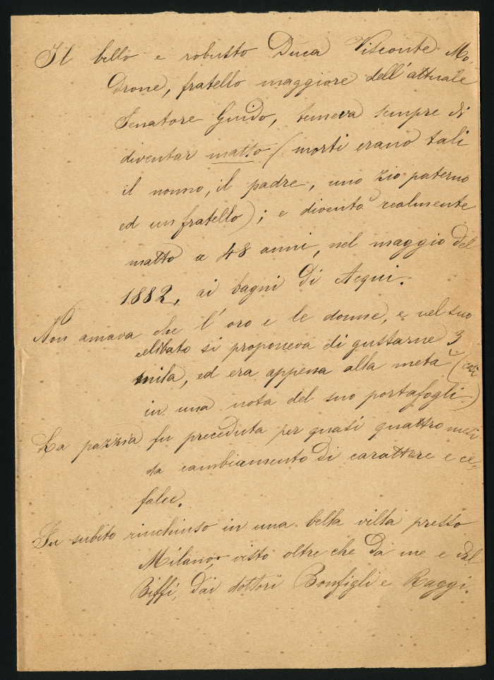 80) Pallavicino [Trivulzio] Giorgio, patriota, gran collare dell'Annunciata, prodittatore a Napoli: domande rivolte al dottor Verga in merito alla cura indicata dal prof. Verdona, con relative risposte scritte in settembre da Cannobio, appunti sullo stato di salute del malato. Melancolia senile.
