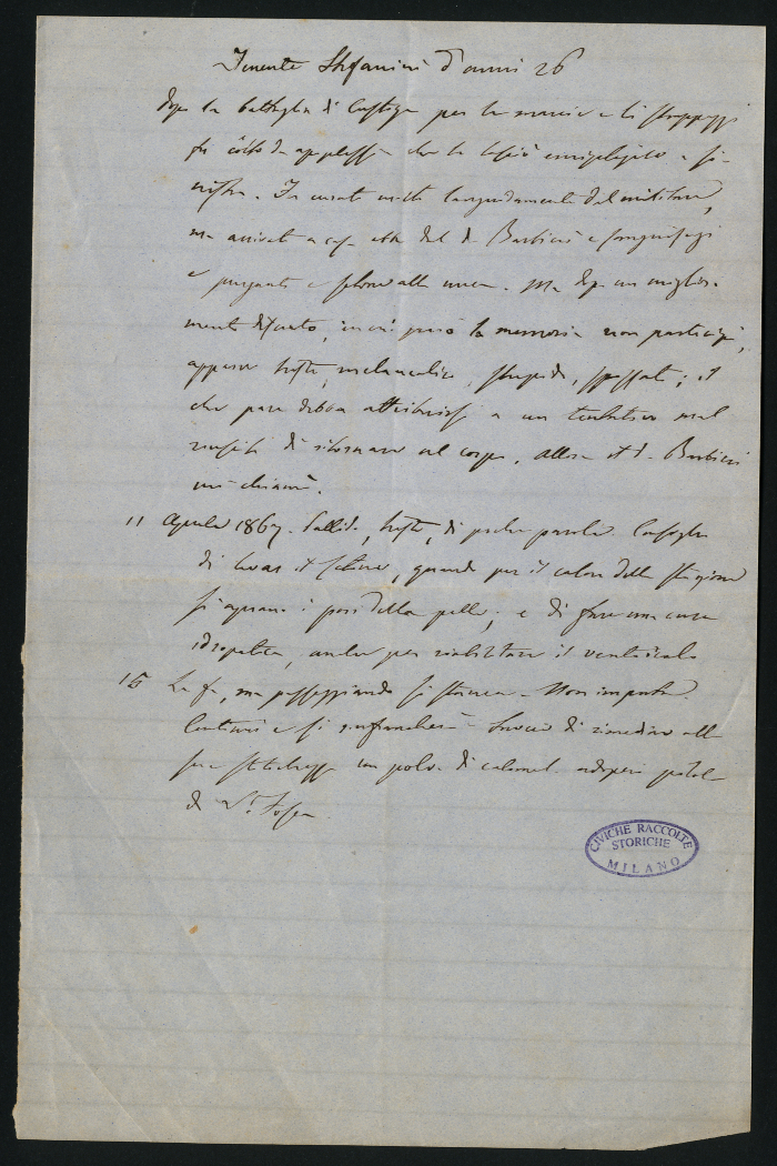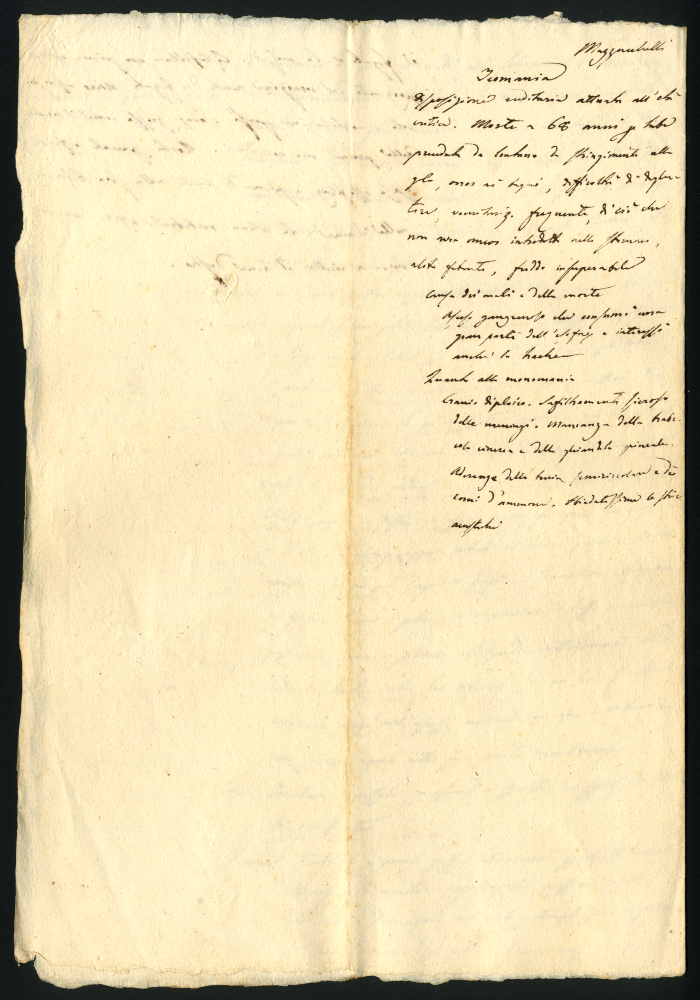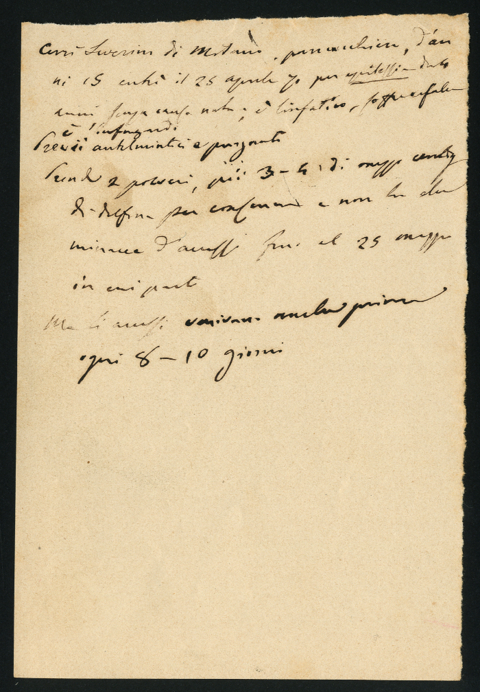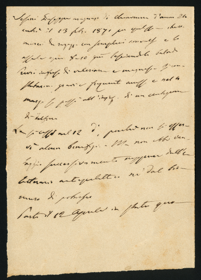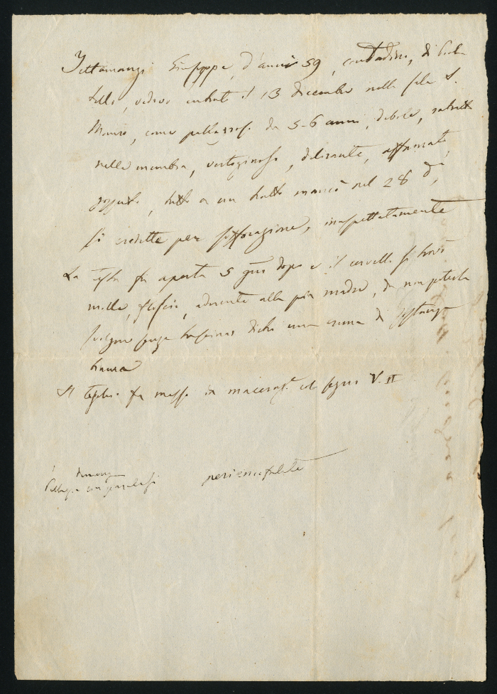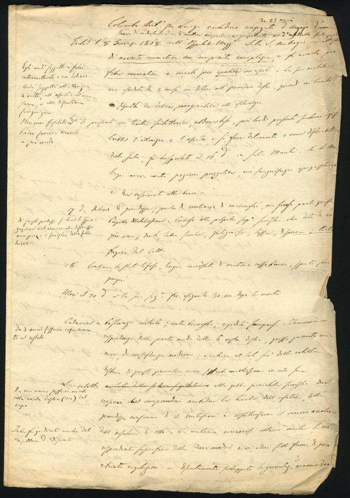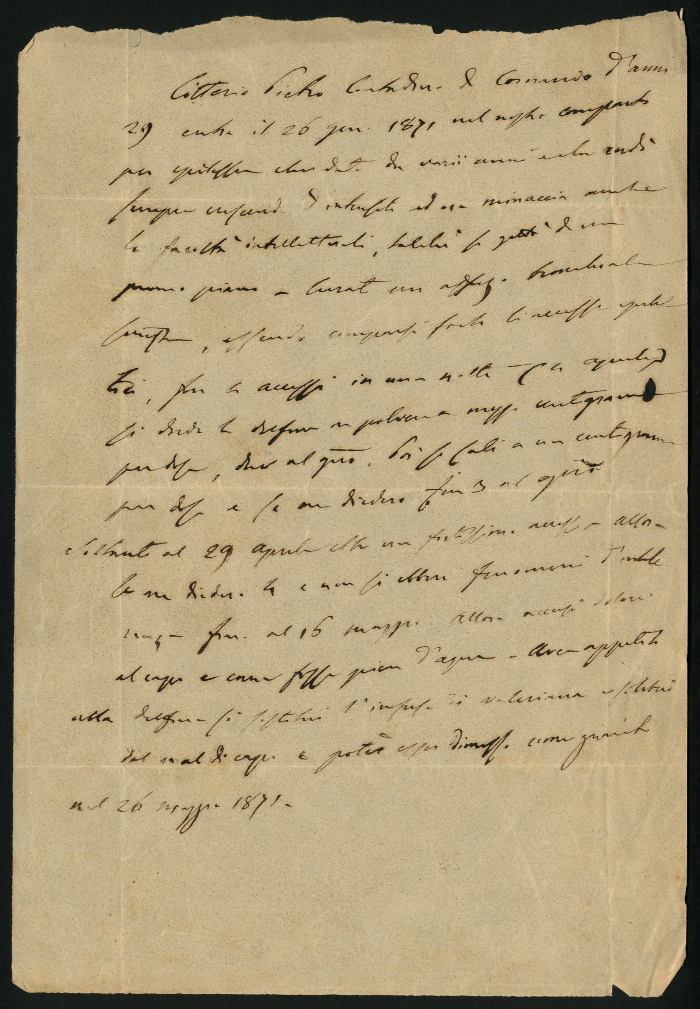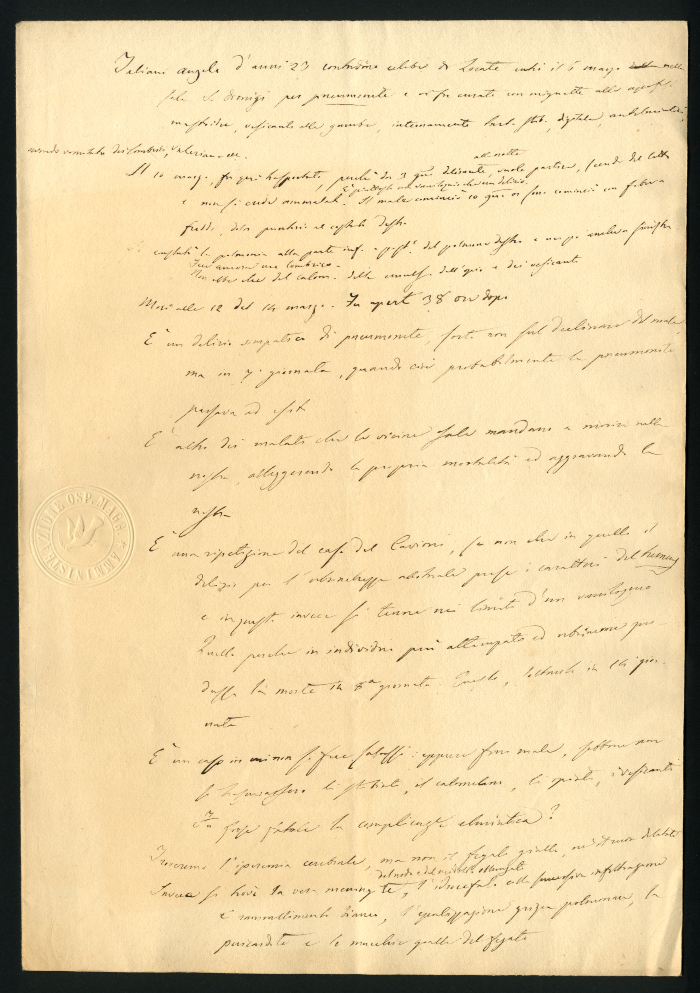 80) Pallavicino [Trivulzio] Giorgio, patriota, gran collare dell'Annunciata, prodittatore a Napoli: domande rivolte al dottor Verga in merito alla cura indicata dal prof. Verdona, con relative risposte scritte in settembre da Cannobio, appunti sullo stato di salute del malato. Melancolia senile.