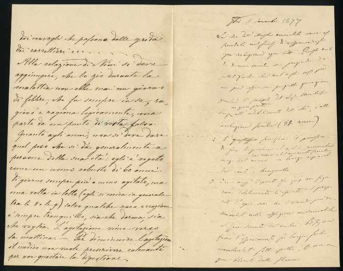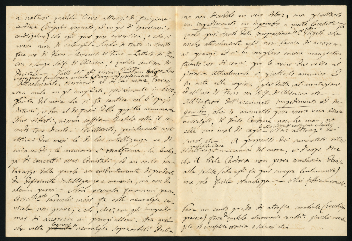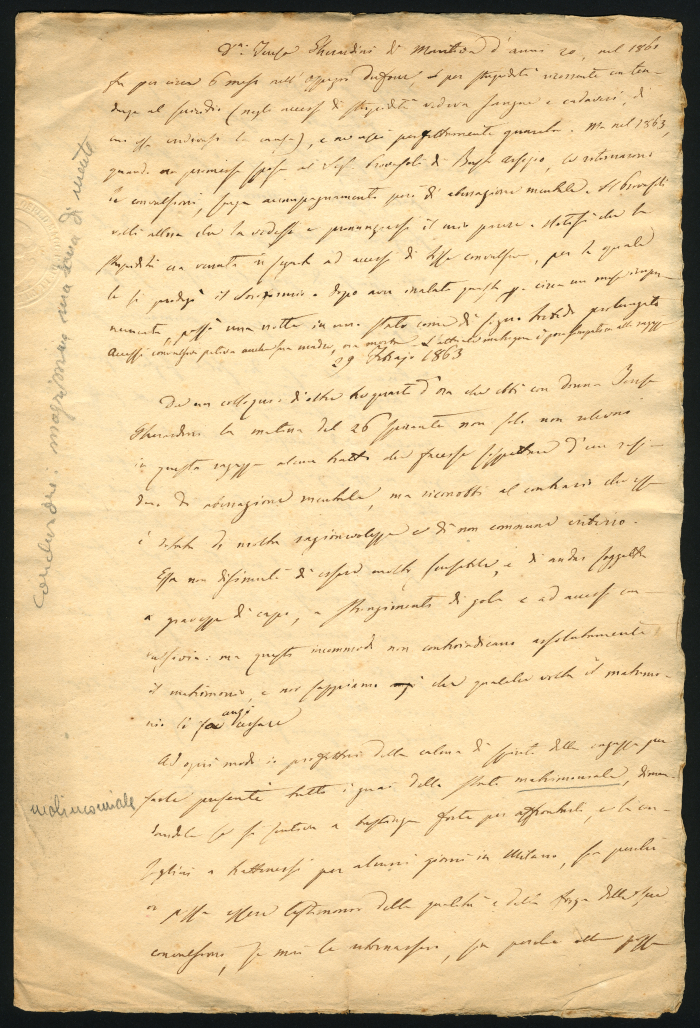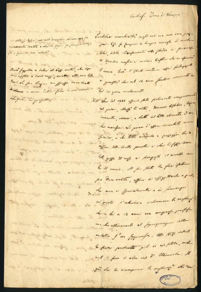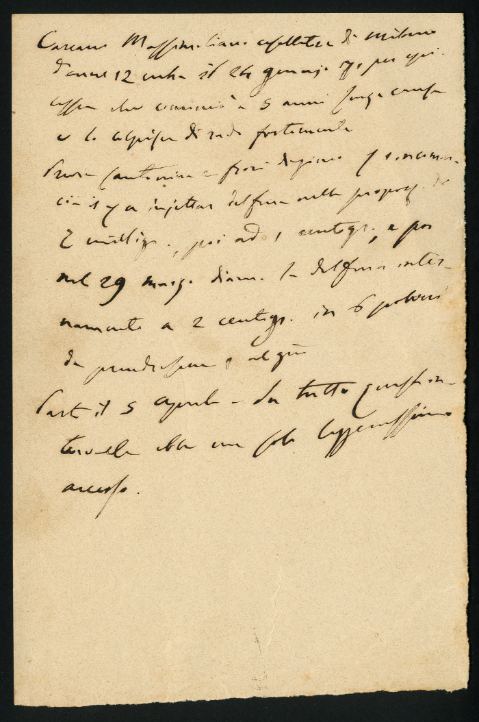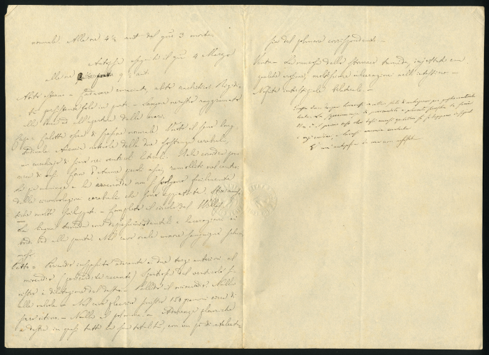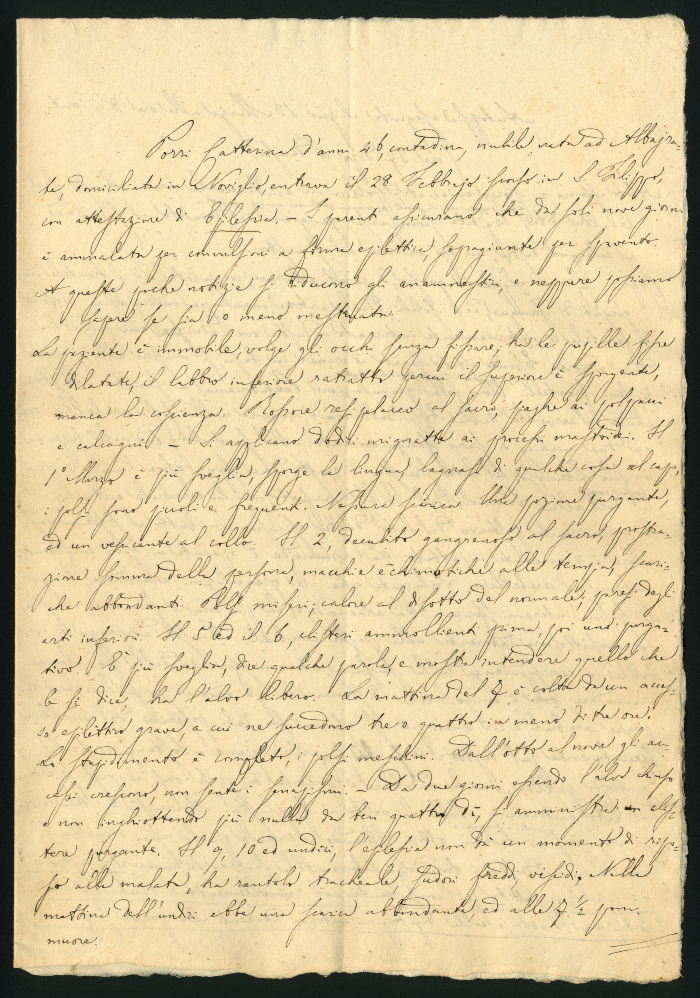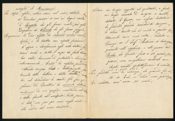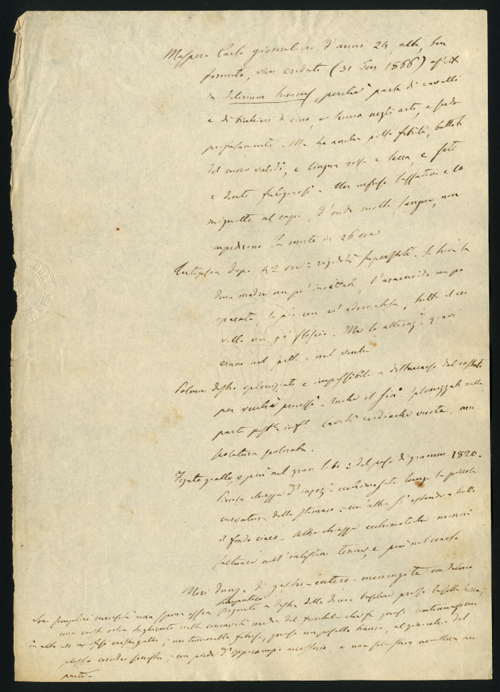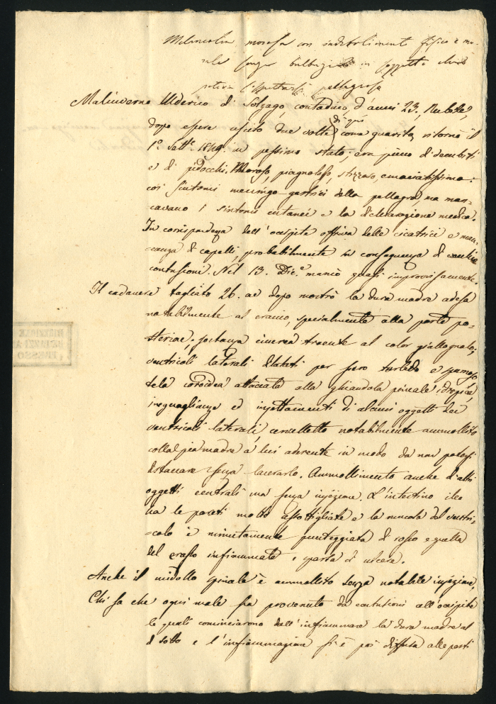 80) Pallavicino [Trivulzio] Giorgio, patriota, gran collare dell'Annunciata, prodittatore a Napoli: domande rivolte al dottor Verga in merito alla cura indicata dal prof. Verdona, con relative risposte scritte in settembre da Cannobio, appunti sullo stato di salute del malato. Melancolia senile.