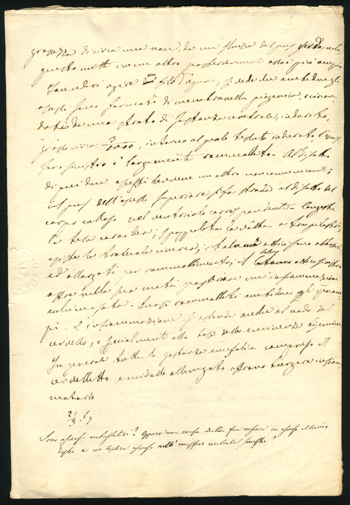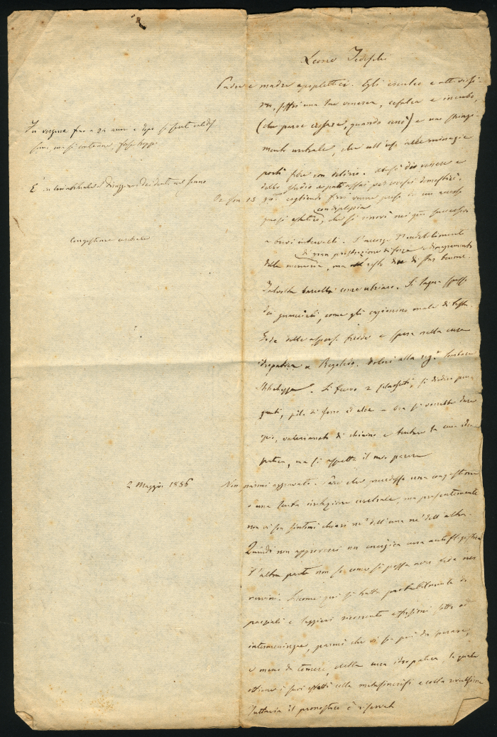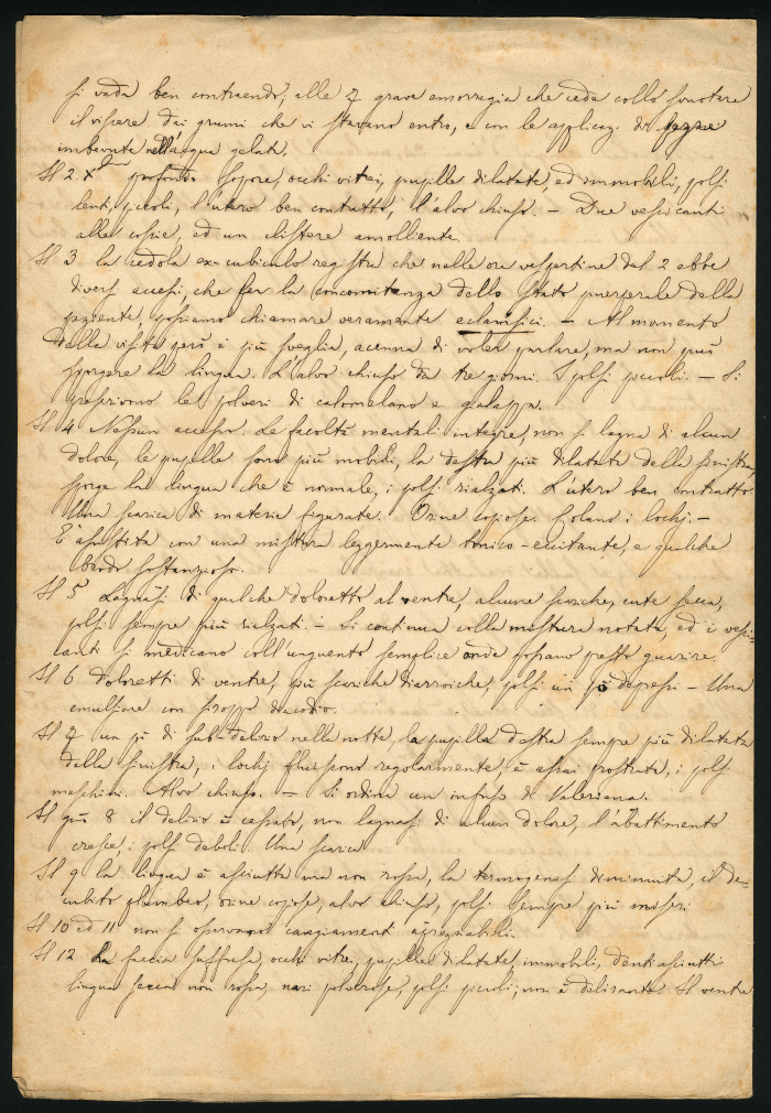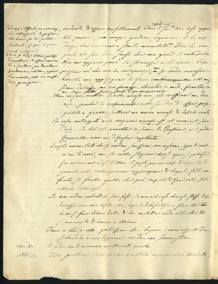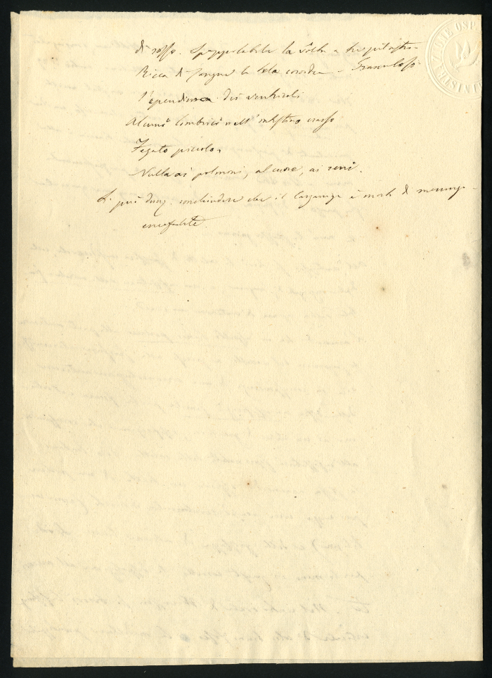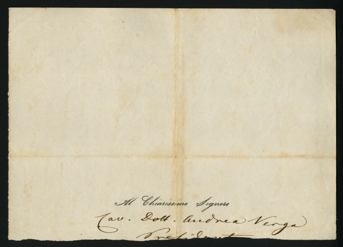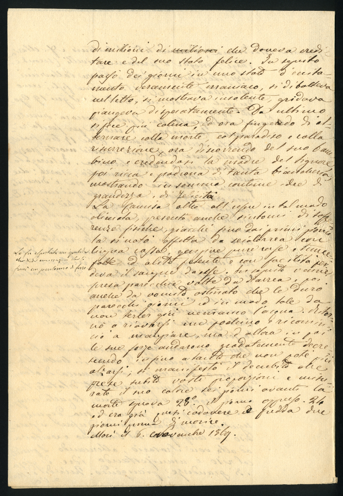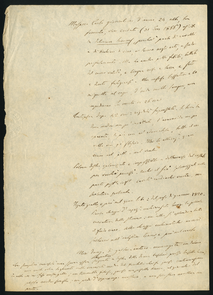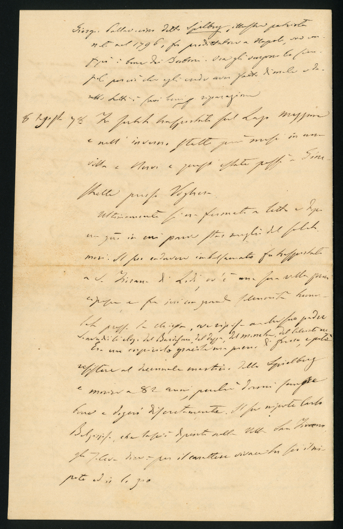 80) Pallavicino [Trivulzio] Giorgio, patriota, gran collare dell'Annunciata, prodittatore a Napoli: domande rivolte al dottor Verga in merito alla cura indicata dal prof. Verdona, con relative risposte scritte in settembre da Cannobio, appunti sullo stato di salute del malato. Melancolia senile.
