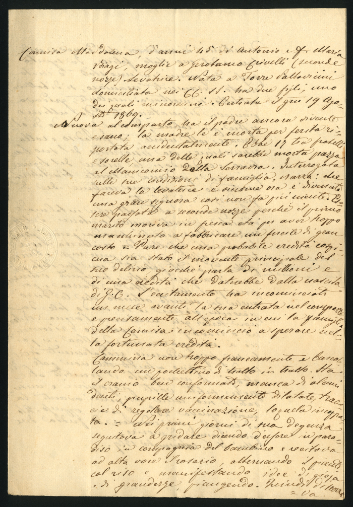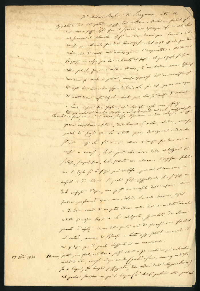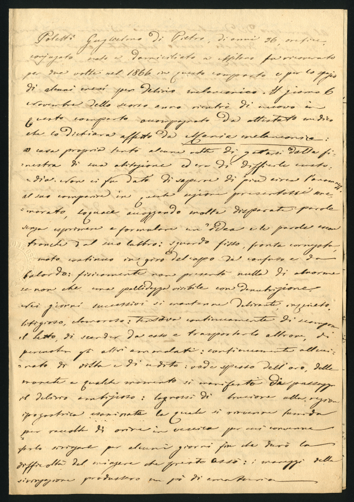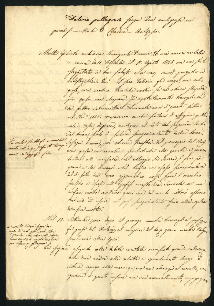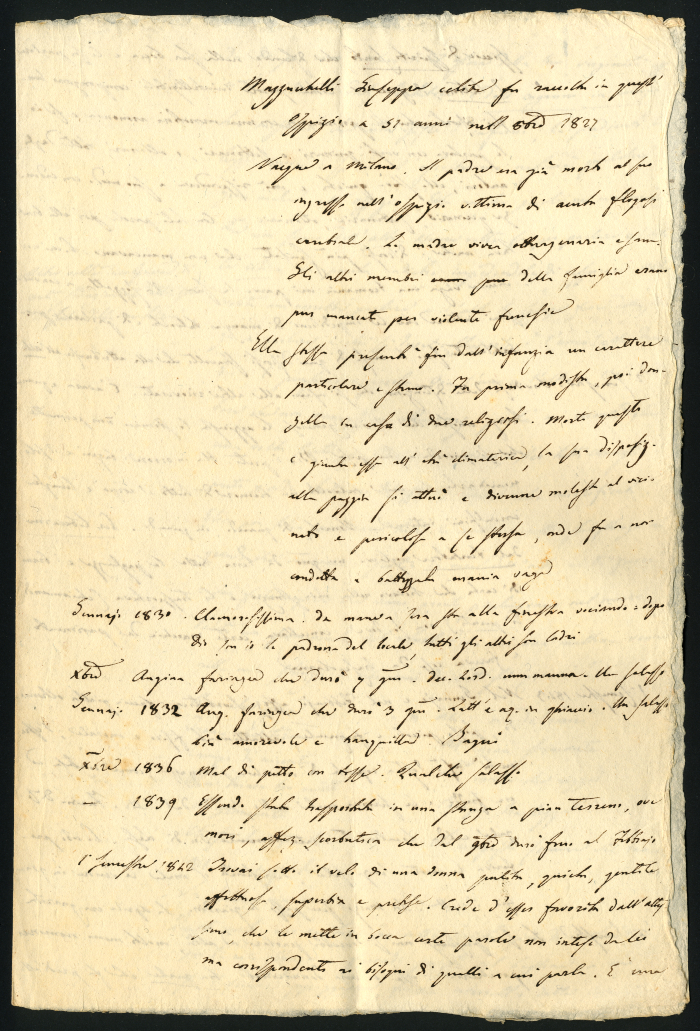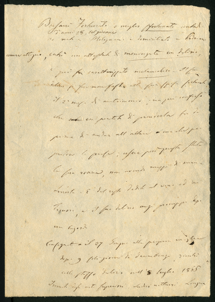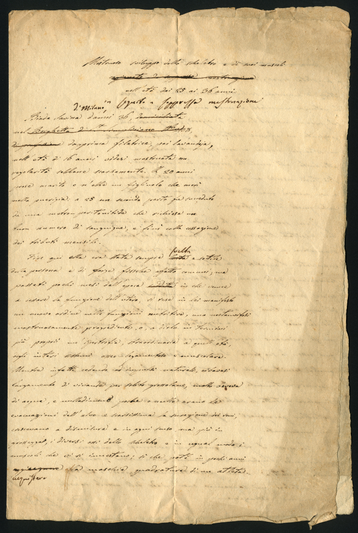 7) Baglioni don Andrea di Bergamo città alta, 54 anni, coniugato, distinto suonatore di violoncello, nel 1838 guardia nobile: anamnesi. Demenza con paralisi generale.