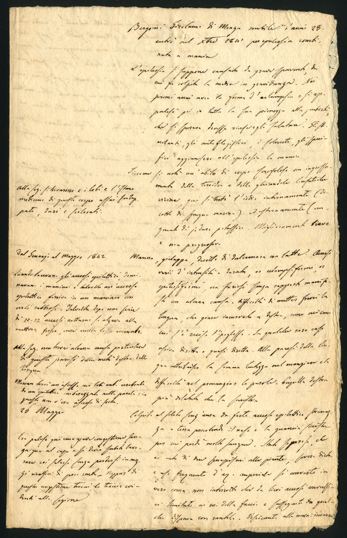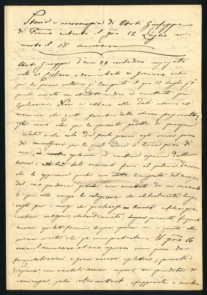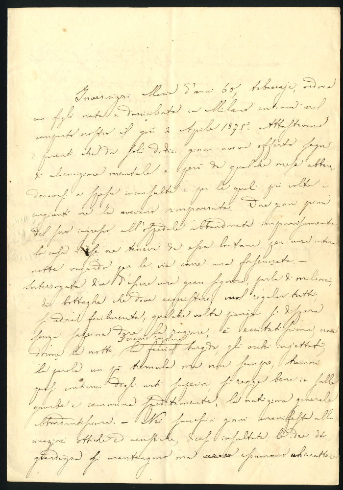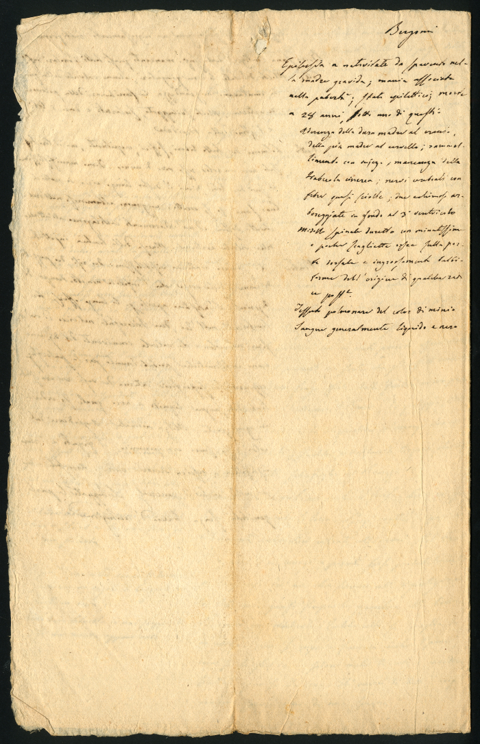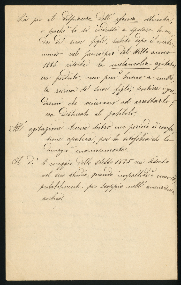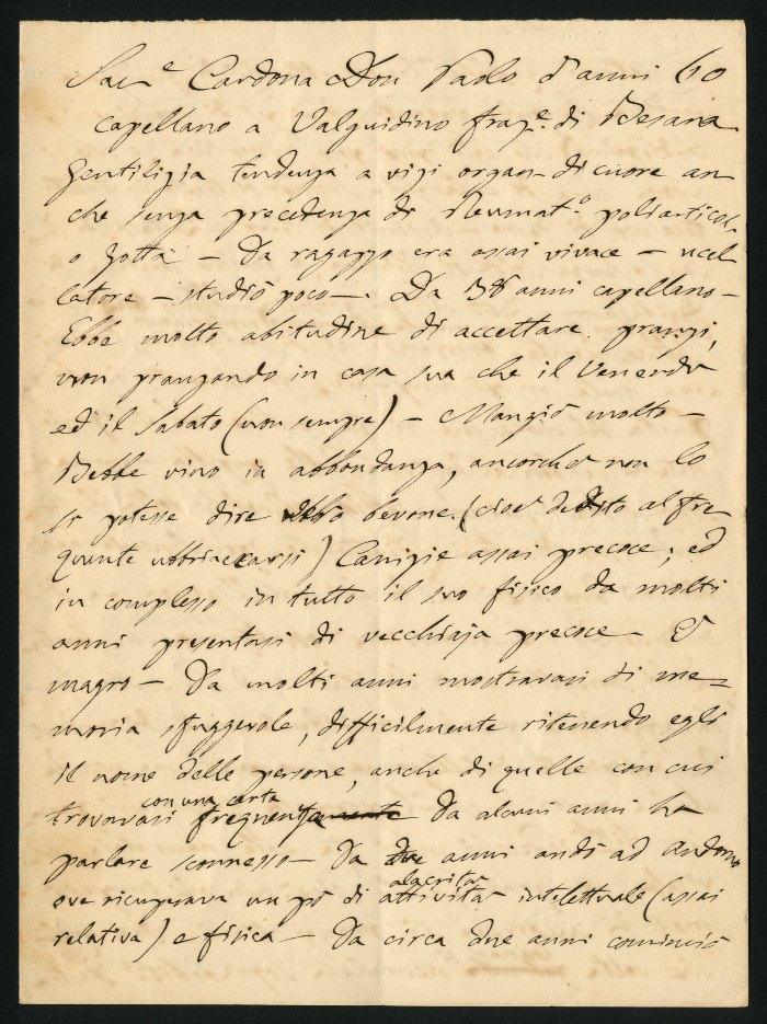 7) Baglioni don Andrea di Bergamo città alta, 54 anni, coniugato, distinto suonatore di violoncello, nel 1838 guardia nobile: anamnesi. Demenza con paralisi generale.