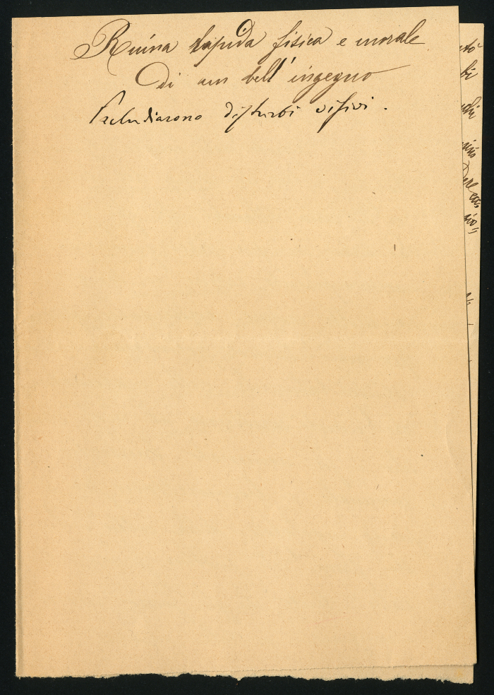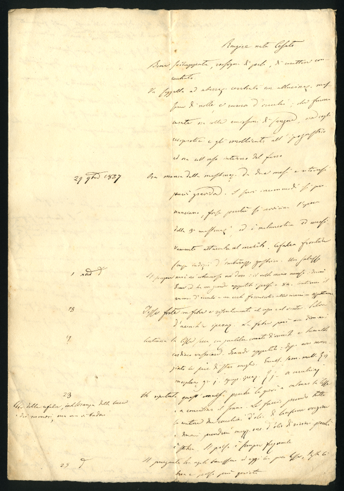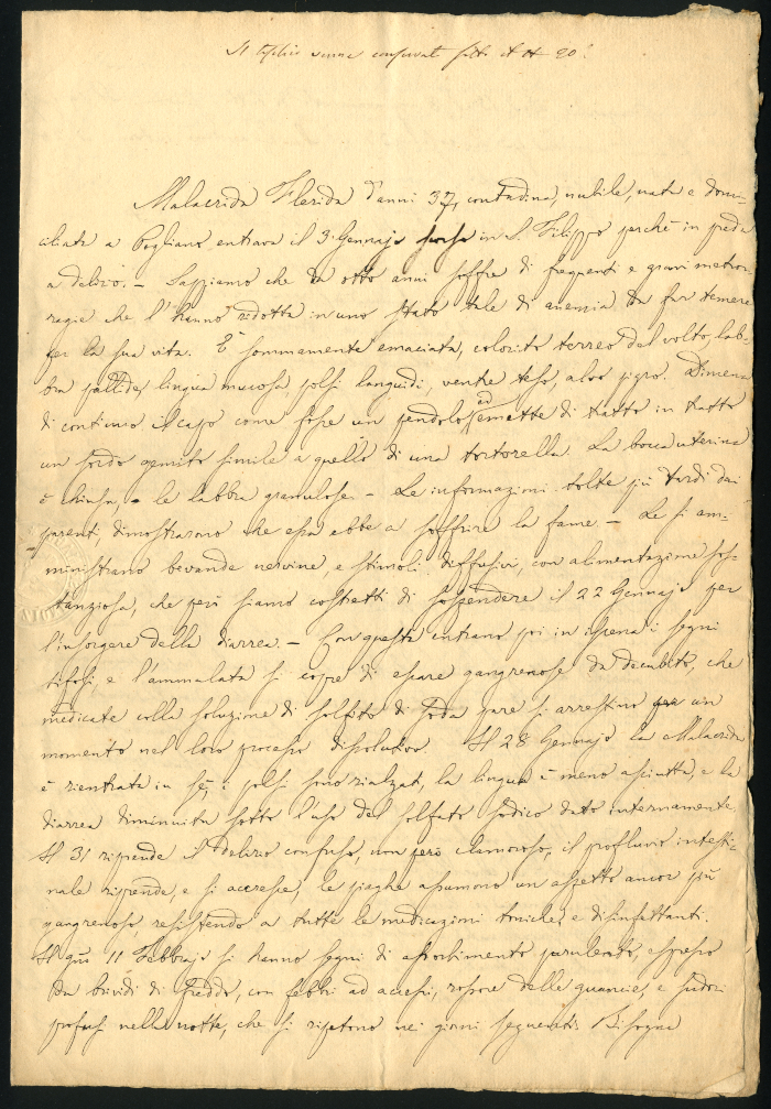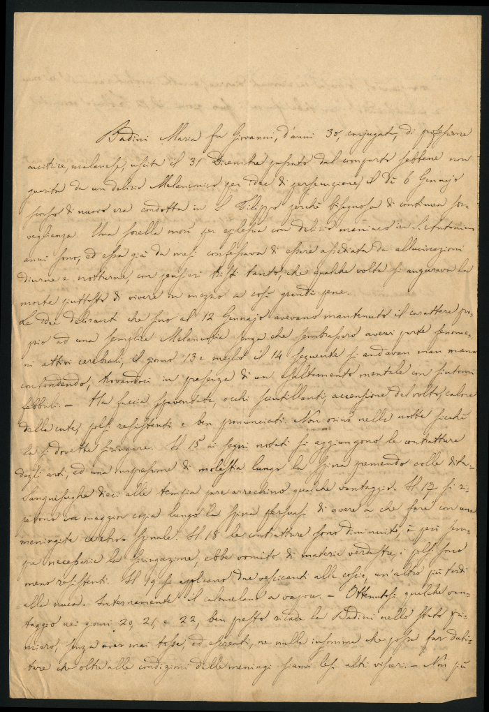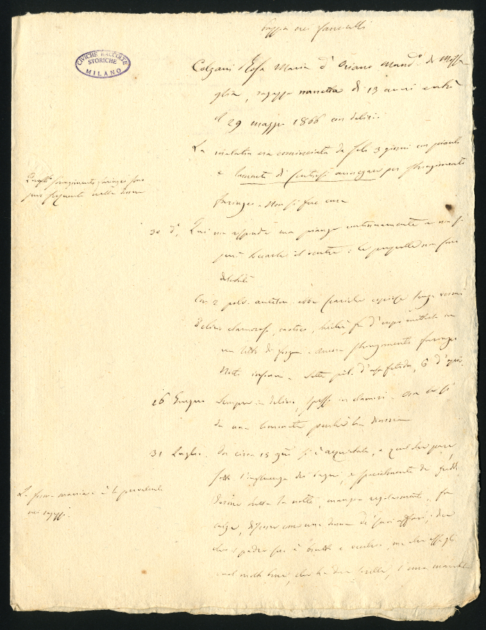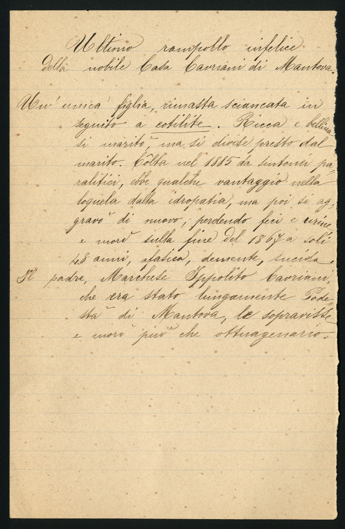 30) L'unica figlia del marchese Cavriani Ippolito, già podestà di Mantova: appunti di storia clinica. Titolo sulla camicia “Ultimo rampollo infelice della nobile Casa Cavriani di Mantova”. Cotilite.