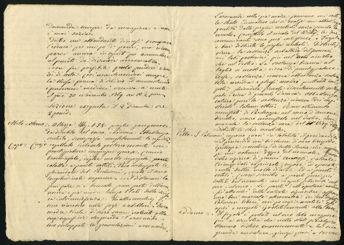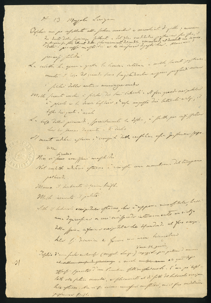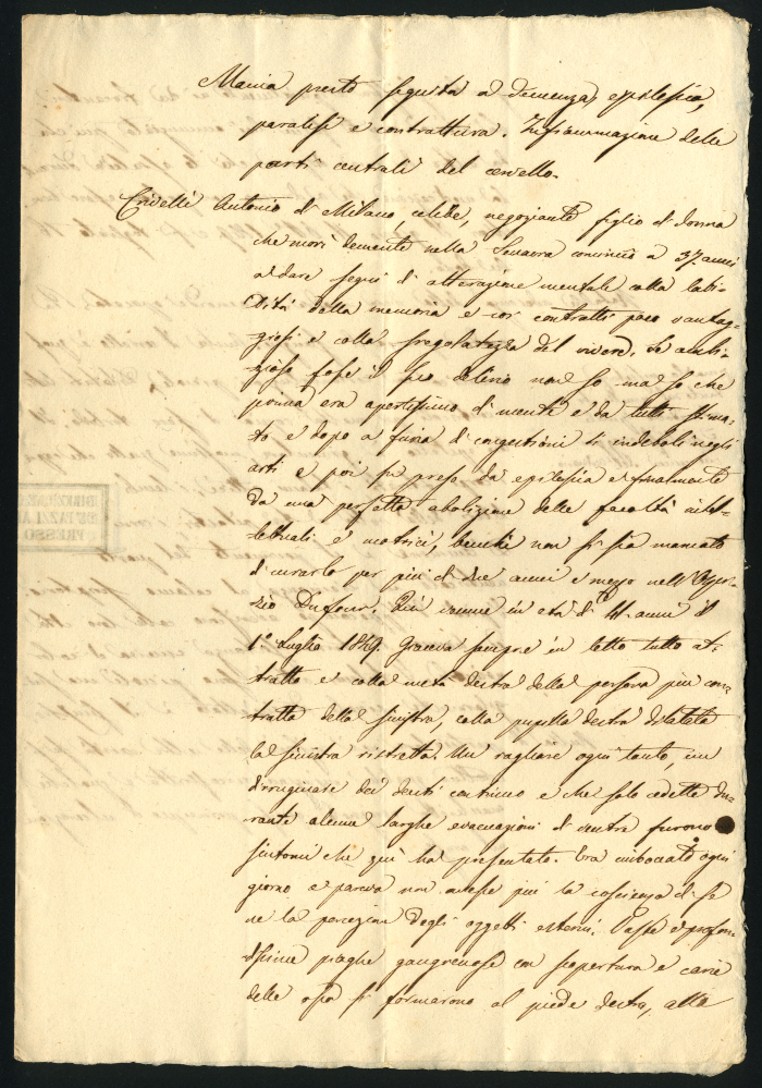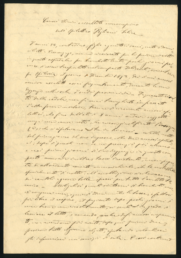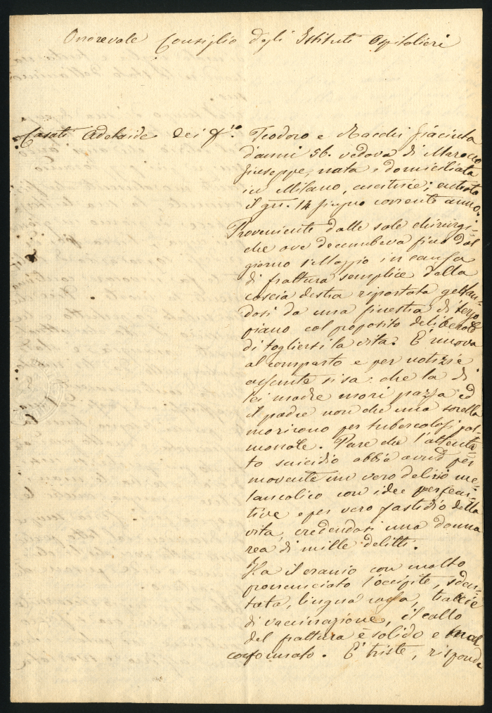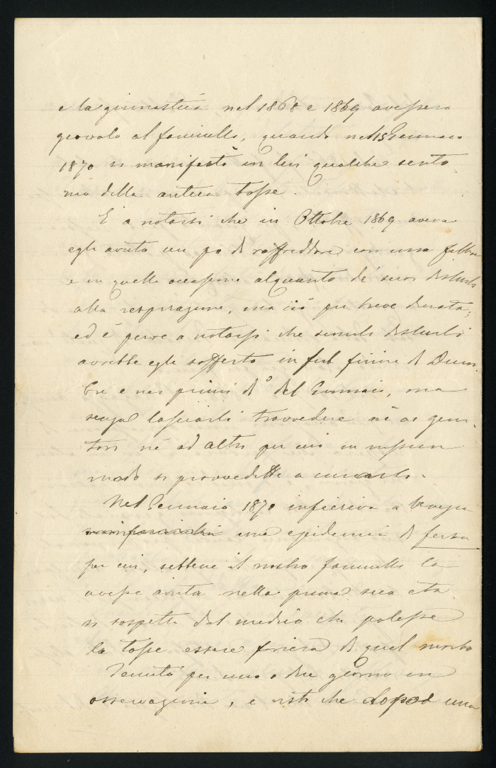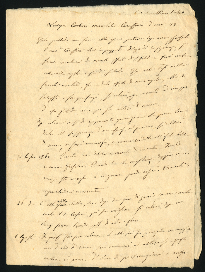 30) L'unica figlia del marchese Cavriani Ippolito, già podestà di Mantova: appunti di storia clinica. Titolo sulla camicia “Ultimo rampollo infelice della nobile Casa Cavriani di Mantova”. Cotilite.