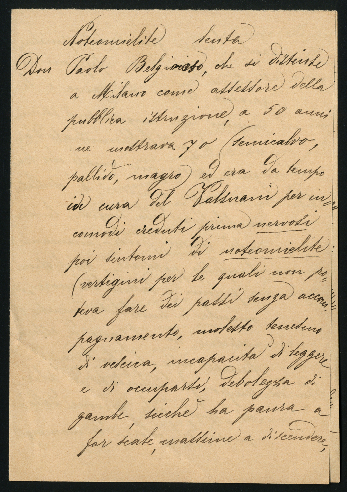 9) Belgiojoso don Paolo, 50 anni, assessore della pubblica istruzione a Milano: anamnesi. Noteomielite lenta seguita da completa paraplegia.
