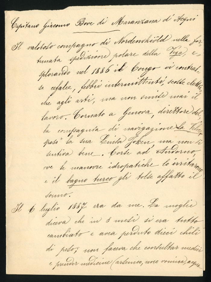 19) Bove Giacomo di Maranzana d'Acqui, capitano, compagno di [Adolf Erik] Nordenskiöld nella fortunata spedizione polare della Vega, direttore della compagnia di navigazione La Veloce, coniugato: breve anamnesi. Melancolia a base ipocondriaca.