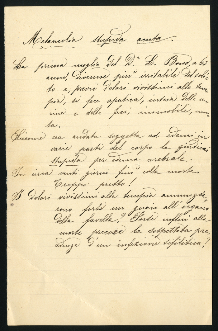 18) La prima moglie del dottor Bono L[uigi], 65 anni: appunti di storia clinica. Melancolia stupida acuta.