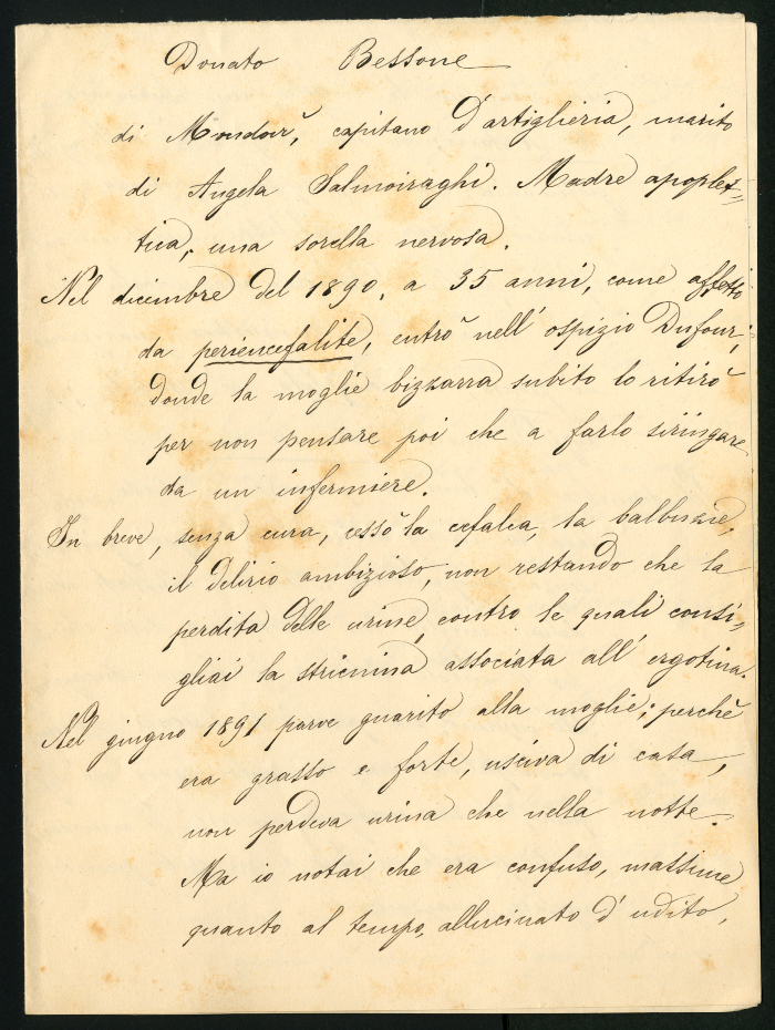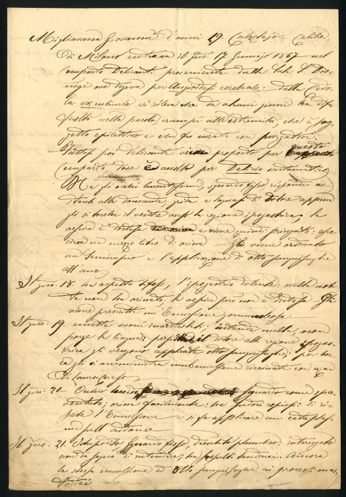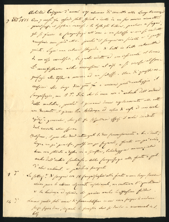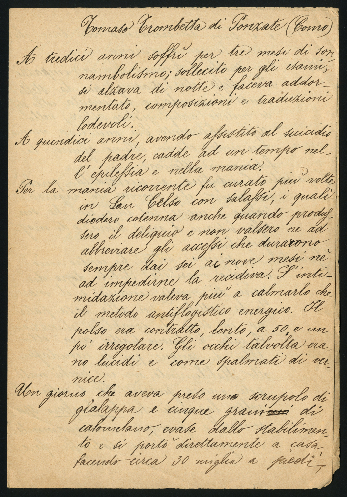 12) Bersani Fortunato, nato a Melegnano e domiciliato a Pedriano, comune attiguo, 28 anni, contadino: appunti di storia clinica. Meningite con delirio melancolico.
