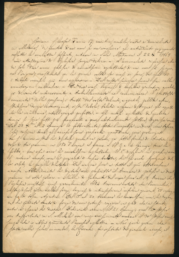 17) Bonasegala Giuseppa, nata a Corsico, domiciliata a Trezzano, 37 anni, nubile, ricoverata il 13 gennaio 1868: anamnesi, autopsia ed esame del cranio. Epilessia.