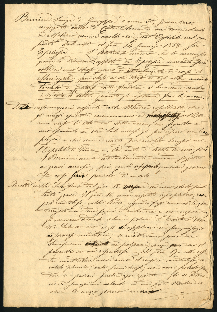 11) Bernini Luigi di Giuseppe, nato a Corte Olona, domiciliato a Milano, 30 anni, giornaliero, coniugato: anamnesi e autopsia. Epilessia.