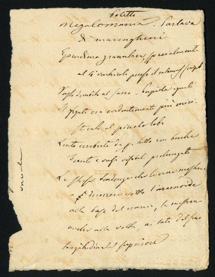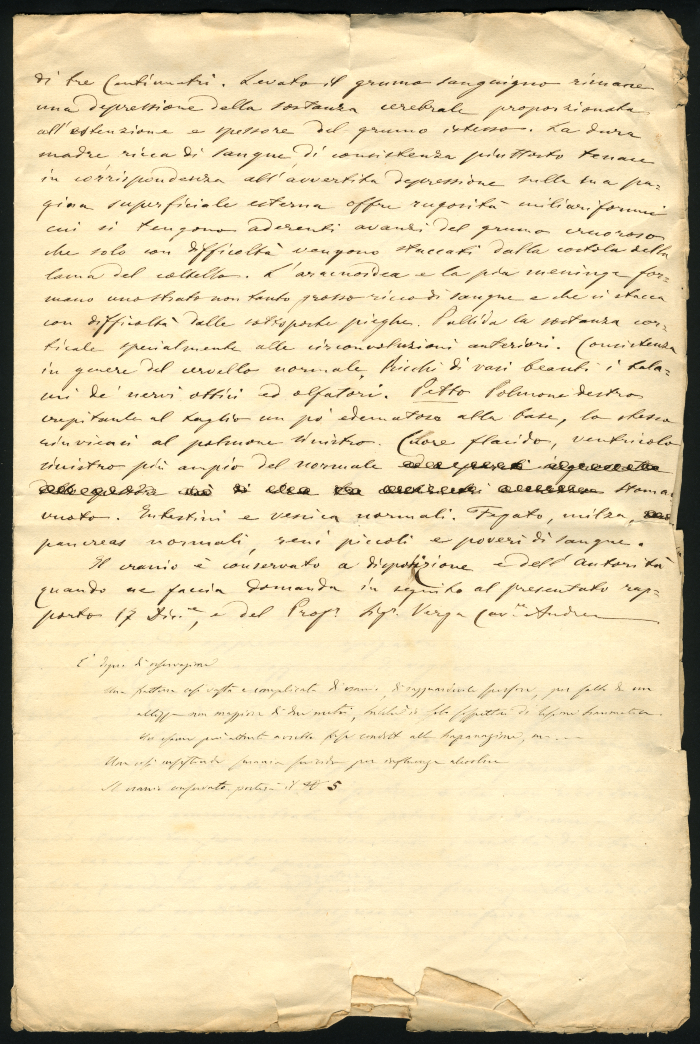 10) Bergomi Girolamo di Monza, 28 anni, celibe, entrò nel dicembre 1841: anamnesi e sezione. Epilessia dalla nascita a causa di spavento nella madre gravida e mania associata alla pubertà.
