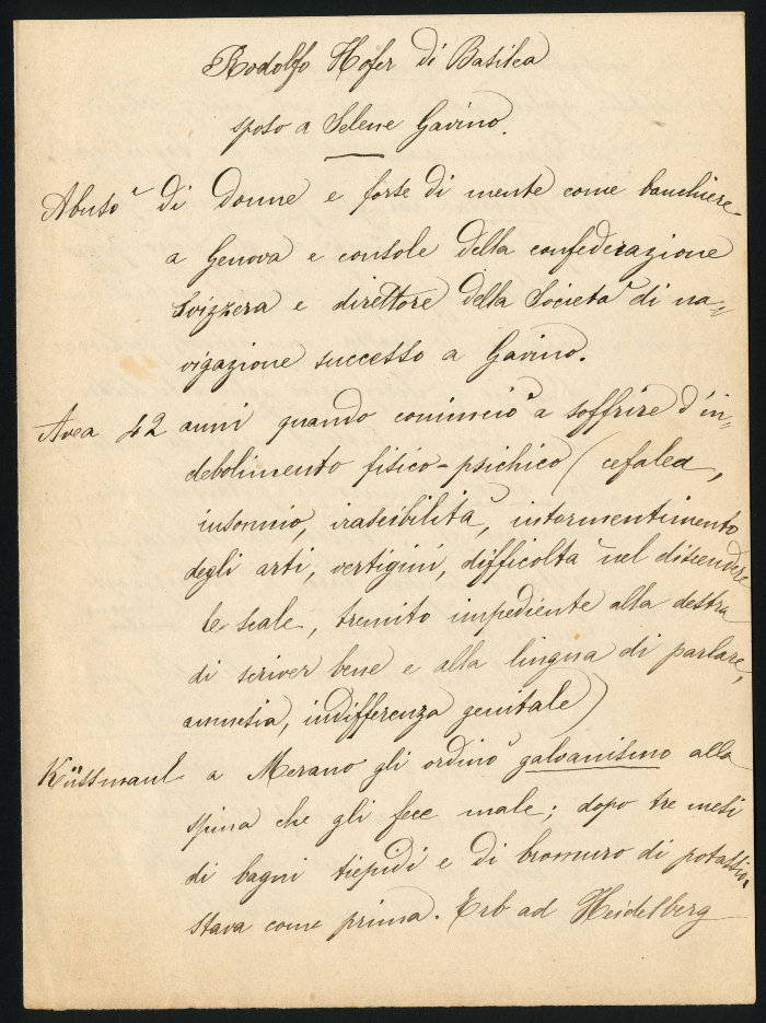 59) Hofer Rodolfo di Basilea, 42 anni, marito di Selene Gavino, banchiere a Genova, console della confederazione Svizzera e direttore della Società di navigazione: anamnesi.
