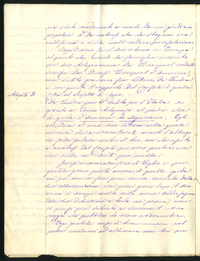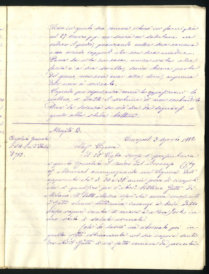 53) Gatti Vittorio di Milano, 36 anni: fascicolo inviato dal R° Viceconsole reggente A. Passoni al prefetto di Como con inserti allegati A-B. In apertura si colloca un parere circa lo stato mentale del paziente a partire da quanto indicato nel fascicolo e una breve anamnesi che si arresta all'ottobre 1884.
