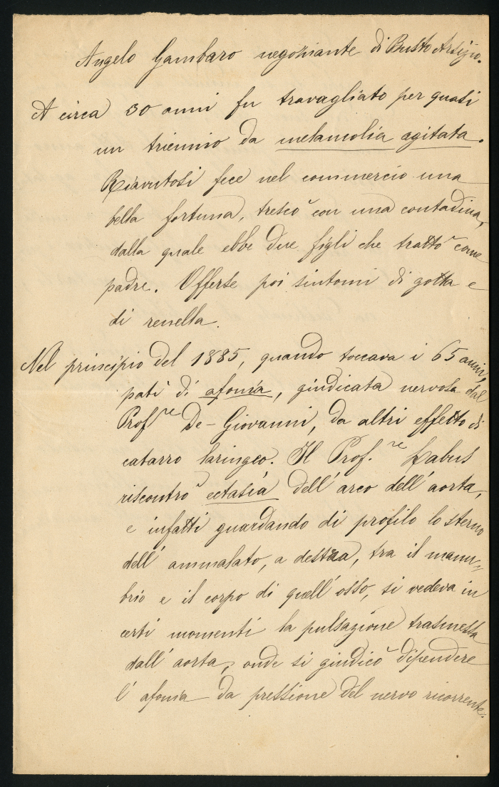 52) Gambaro Angelo, negoziante di Busto Arsizio: anamnesi. Melancolia complicata da aneurisma aortico fatale.
