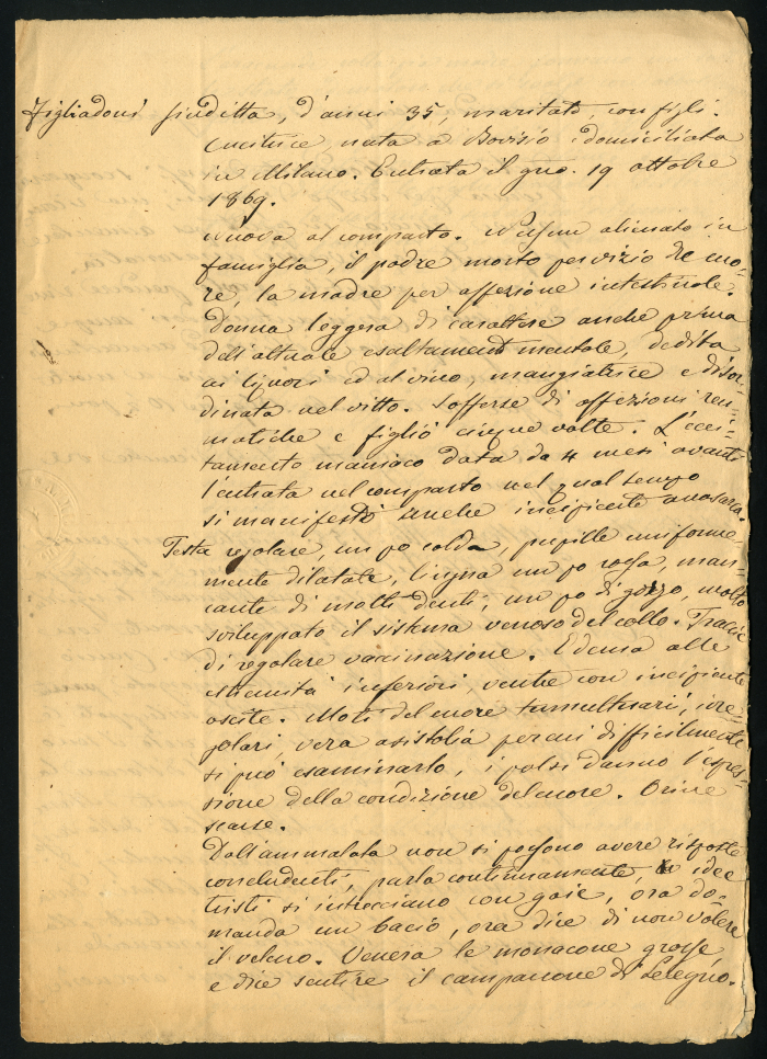 48) Figliadoni Giuditta, domiciliata in Milano, 35 anni, cucitrice, coniugata: anamnesi e sezione.