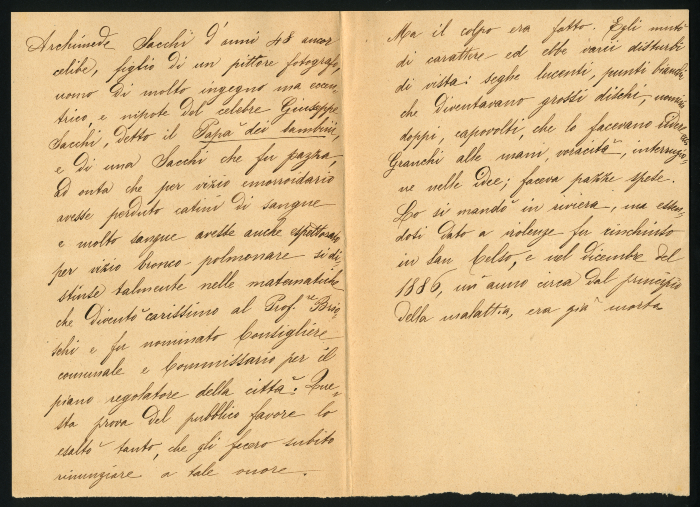 90) Sacchi Archimede, figlio di [Luigi], pittore fotografo, nipote del celebre Giuseppe Sacchi, 48 anni: appunti di storia clinica. Titolo sulla camicia “Ruina rapida fisica e morale di un bell'ingegno”.