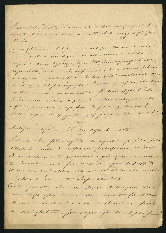 37) Colombo Maria, figlia di Domenico e di Paola Merini, nata a Settimo, domiciliata nei Corpi Santi [Milano], 46 anni: anamnesi e autopsia.