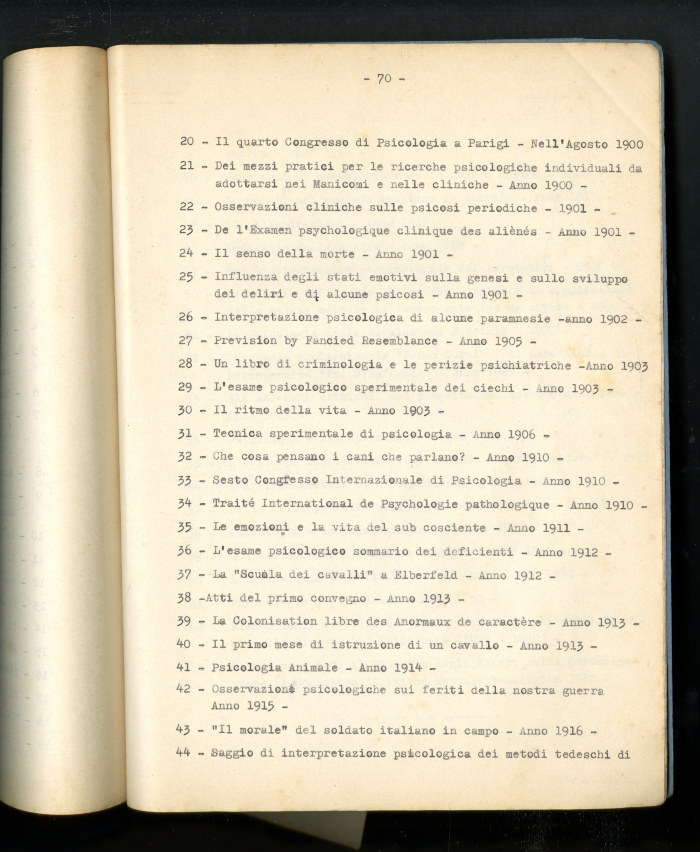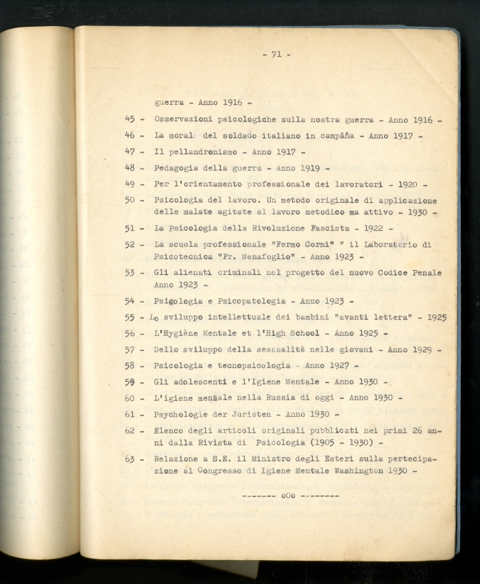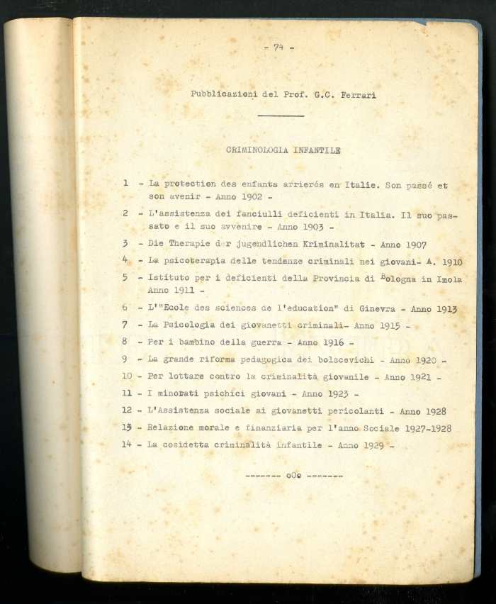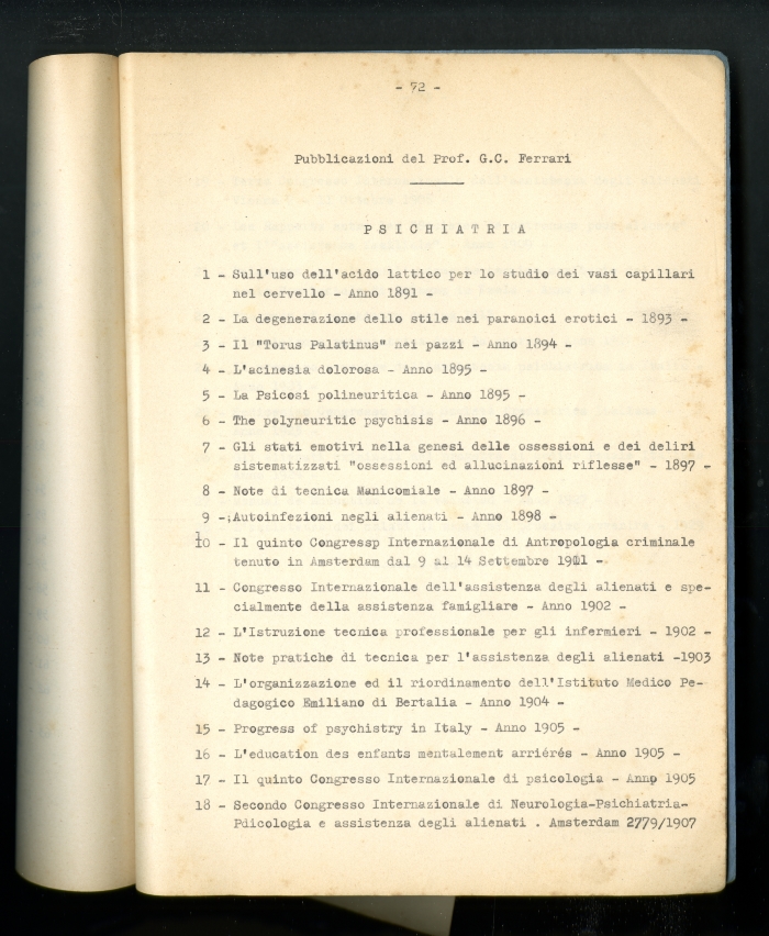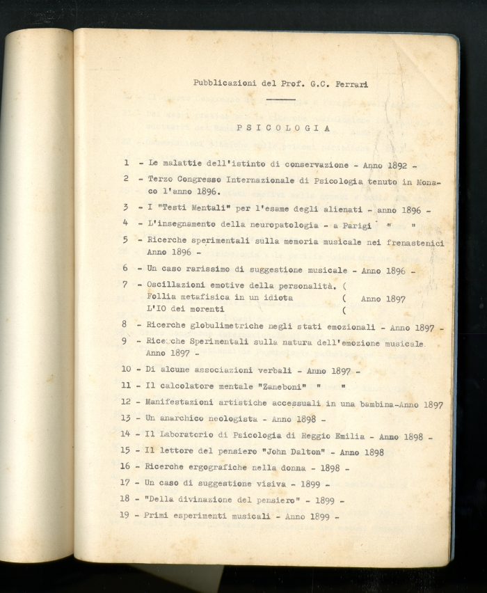 Tesi di laurea di Angela Centrone intitolata "Giulio Cesare Ferrari psicologo", Facoltà di magistero della Regia Università di Roma, anno accademico 1939-40, relatore prof. Ferruccio Banissoni.