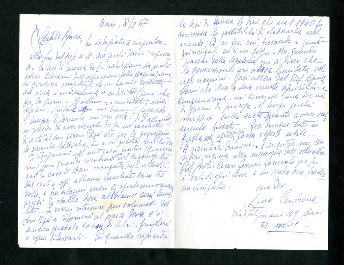 E' presente anche la lettera di accompagnamento all'invio della tesi da parte dell'autrice a Nora Ferrari (8 febbraio 1967).