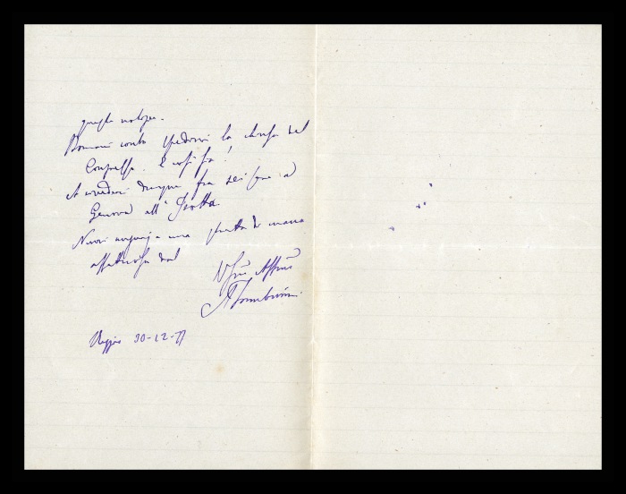 31) Reggio, 23.12.1879: Augusto Tamburini, ottemperando ad una promessa fatta a Napoli, comunica a Biffi la spedizione di una scatola di cappelletti “fatti con tutte le norme del codice tortellinico”, che potrà mangiare il giorno di Natale. Riferisce di averne spediti anche ad [Andrea] Verga. Invia auguri per le festività, ricordando l'appuntamento di gennaio. Invia saluti estesi a Hannan, [Angelo] De Vincenti e Ascoli.