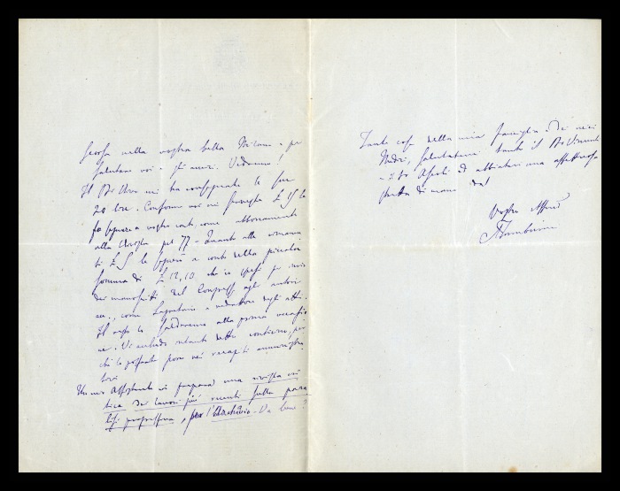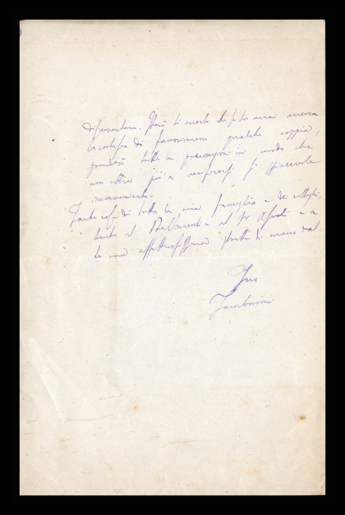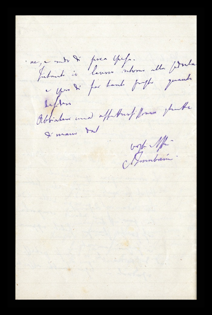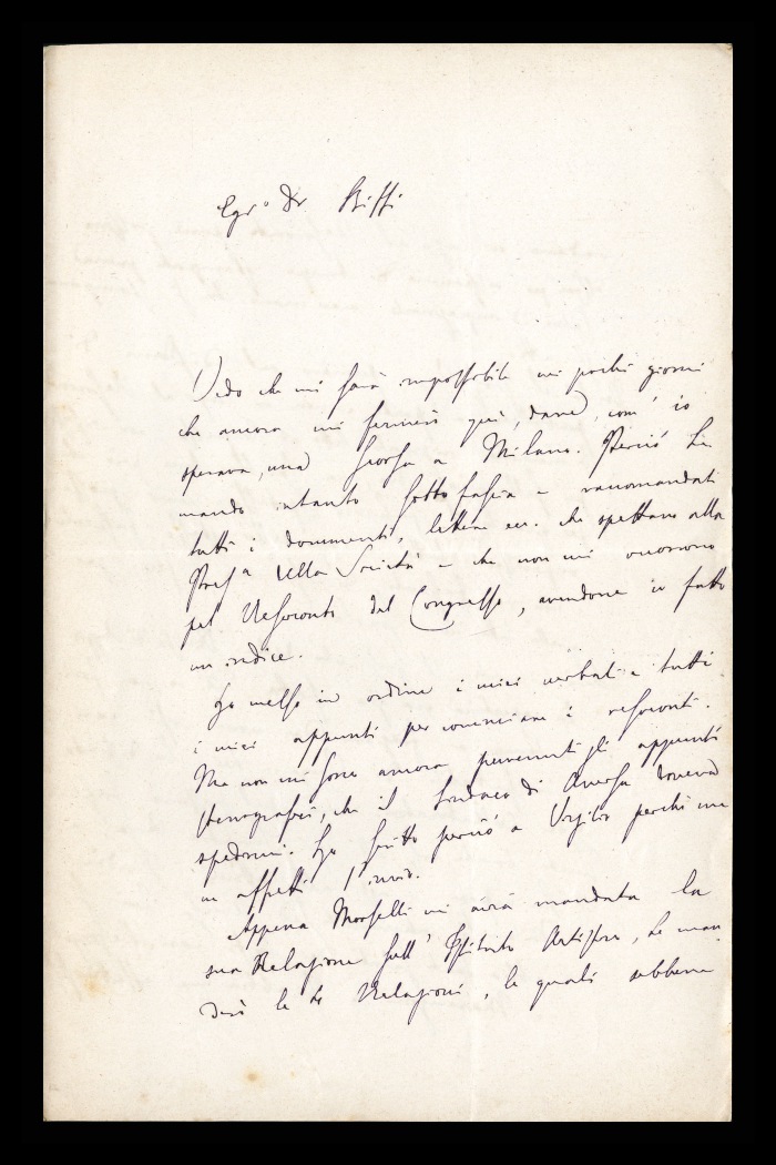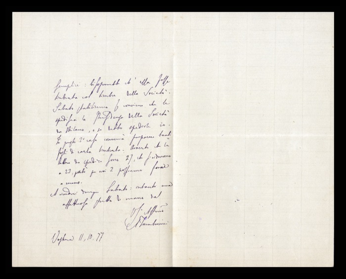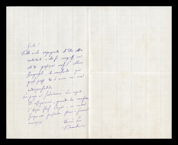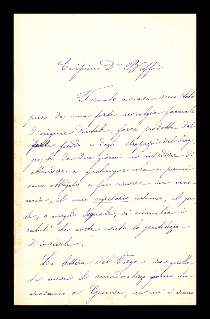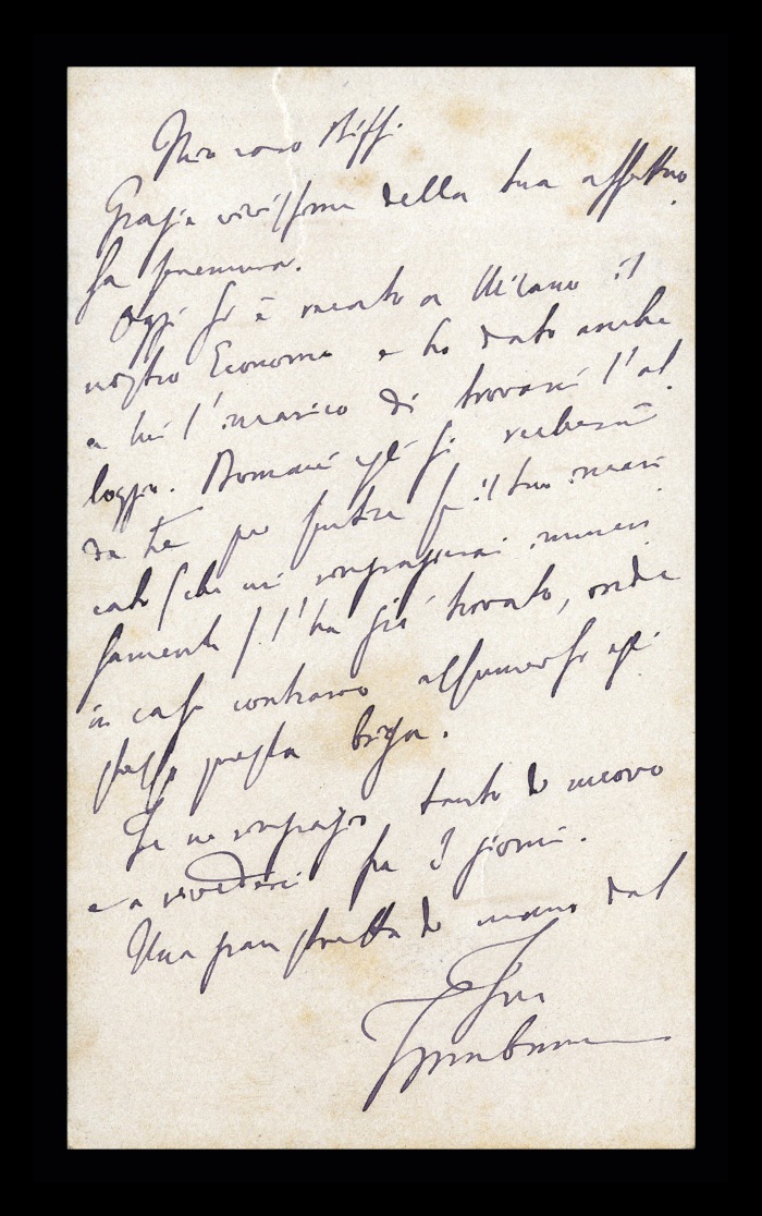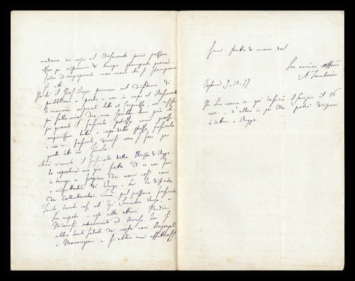 2) Pavia, 16.10.1876: Augusto Tamburini ringrazia Biffi per averlo sostenuto [nella designazione a professore incaricato di medicina e chirurgia presso l'Università di Pavia], invitandolo ad esprimere i sensi della sua gratitudine anche ad [Andrea] Verga. Lo informa di essere a Pavia da pochi giorni, in procinto di partire per poi ritornare all'inizio dell'anno scolastico. Ora che si trovano così vicini, si augura di poter incontrare spesso Biffi e Verga. Invia saluti ad [Angelo] De Vincenti.