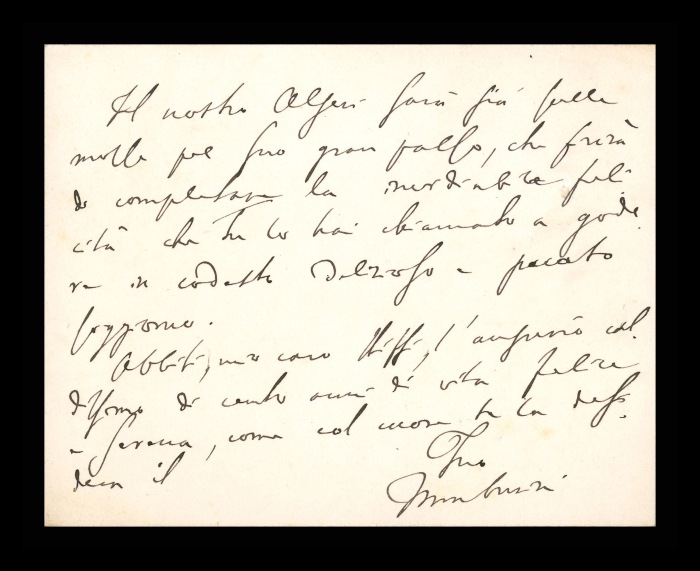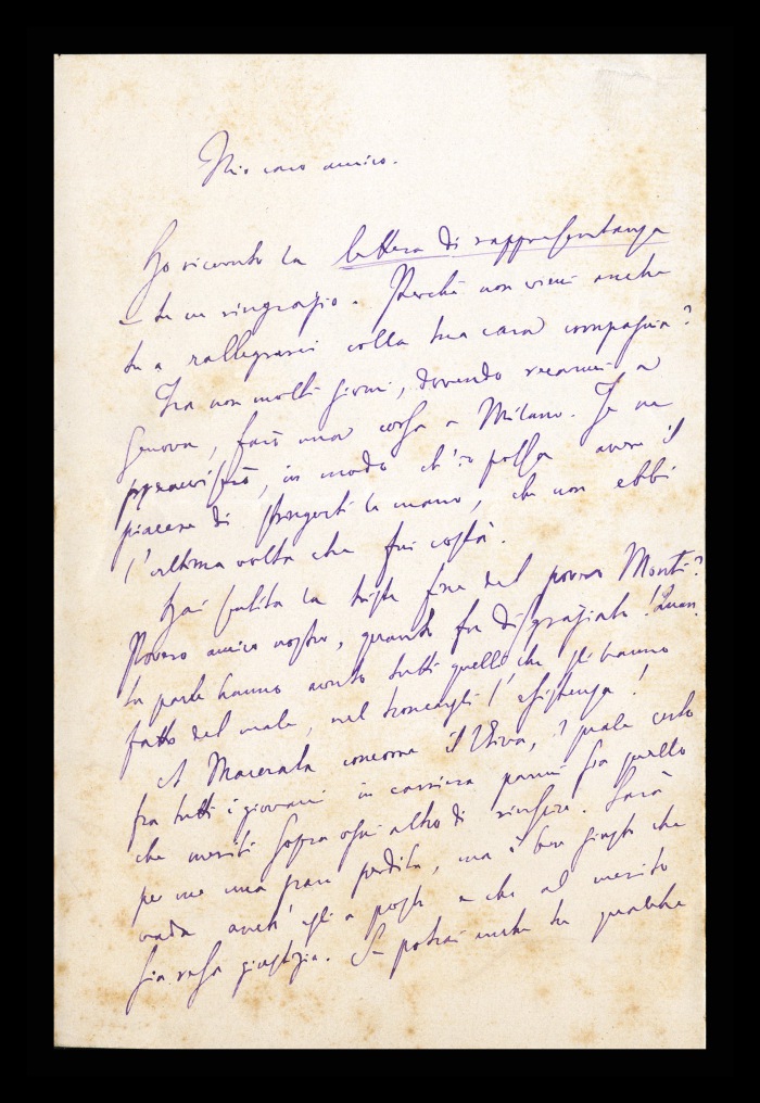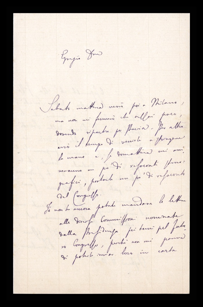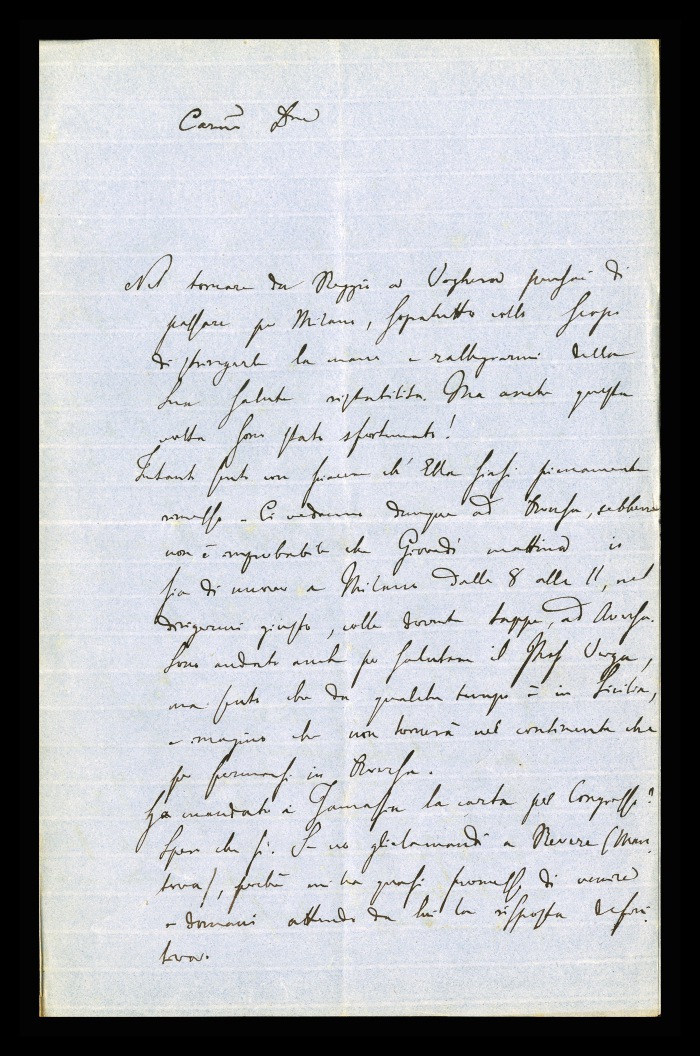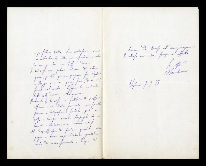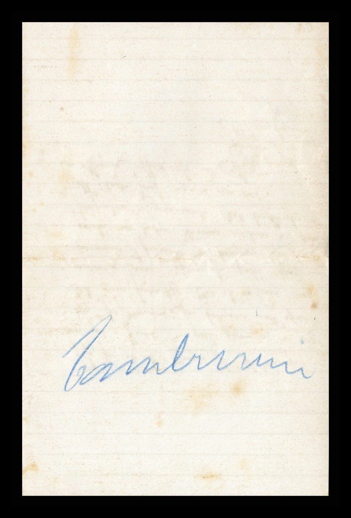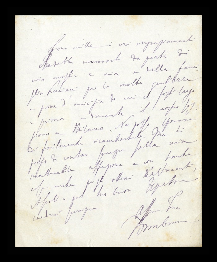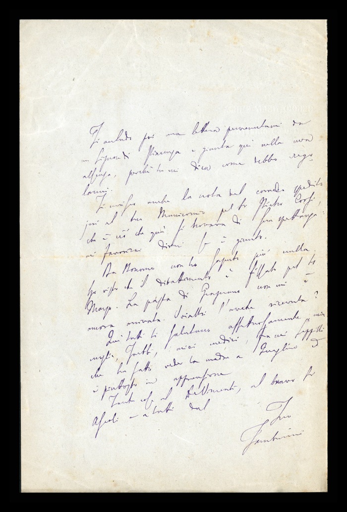 2) Pavia, 16.10.1876: Augusto Tamburini ringrazia Biffi per averlo sostenuto [nella designazione a professore incaricato di medicina e chirurgia presso l'Università di Pavia], invitandolo ad esprimere i sensi della sua gratitudine anche ad [Andrea] Verga. Lo informa di essere a Pavia da pochi giorni, in procinto di partire per poi ritornare all'inizio dell'anno scolastico. Ora che si trovano così vicini, si augura di poter incontrare spesso Biffi e Verga. Invia saluti ad [Angelo] De Vincenti.
