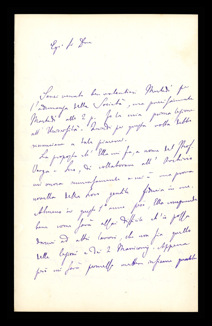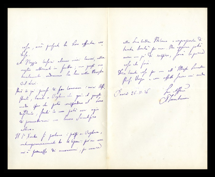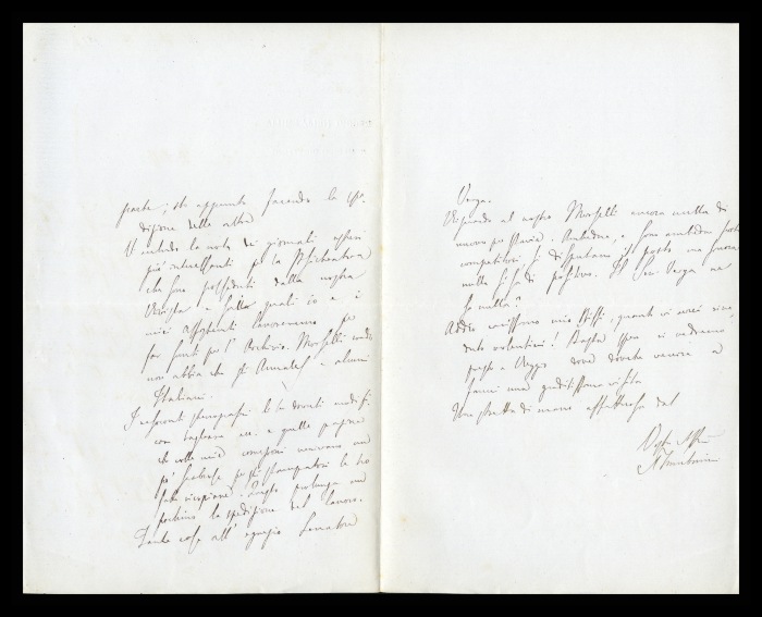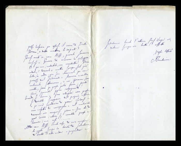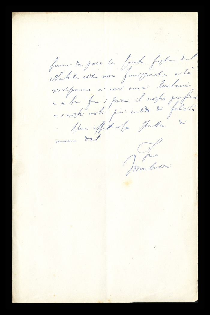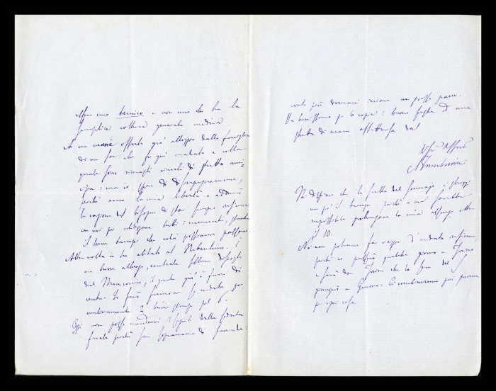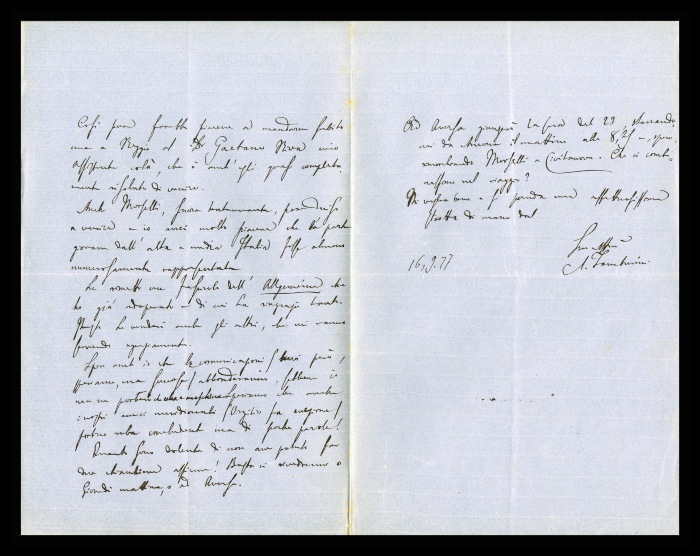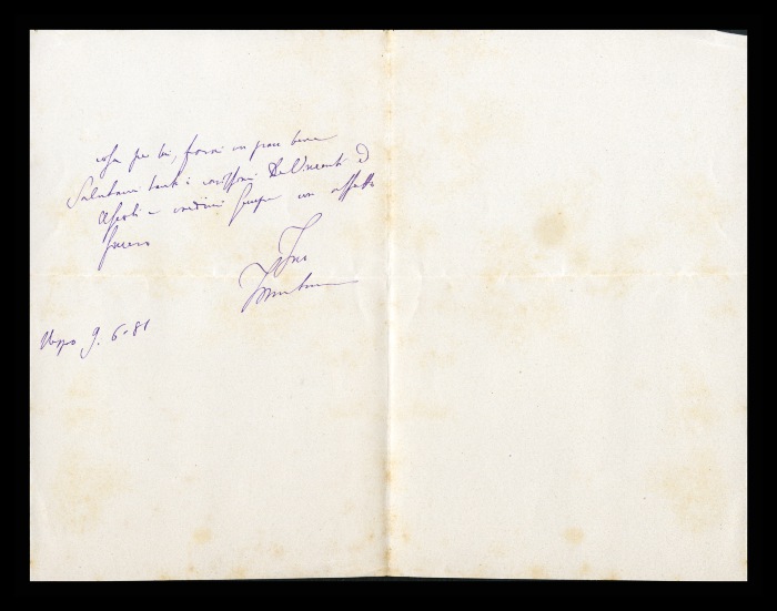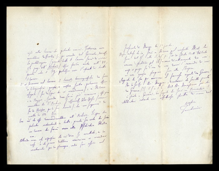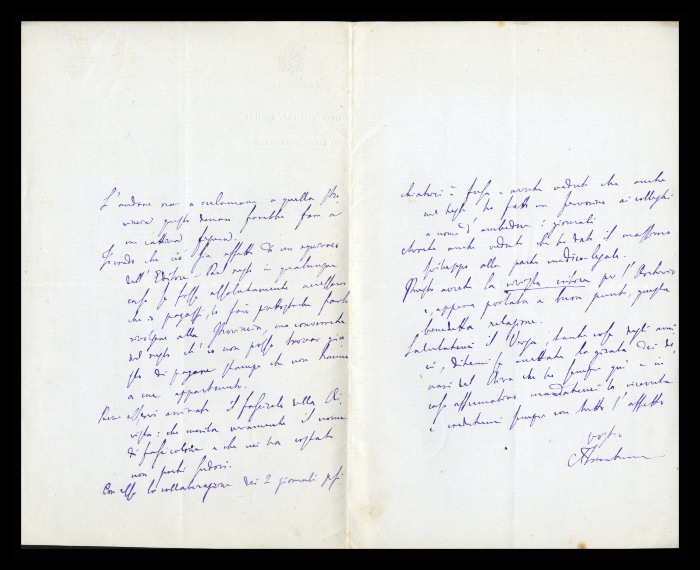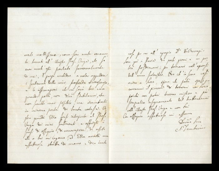 2) Pavia, 16.10.1876: Augusto Tamburini ringrazia Biffi per averlo sostenuto [nella designazione a professore incaricato di medicina e chirurgia presso l'Università di Pavia], invitandolo ad esprimere i sensi della sua gratitudine anche ad [Andrea] Verga. Lo informa di essere a Pavia da pochi giorni, in procinto di partire per poi ritornare all'inizio dell'anno scolastico. Ora che si trovano così vicini, si augura di poter incontrare spesso Biffi e Verga. Invia saluti ad [Angelo] De Vincenti.