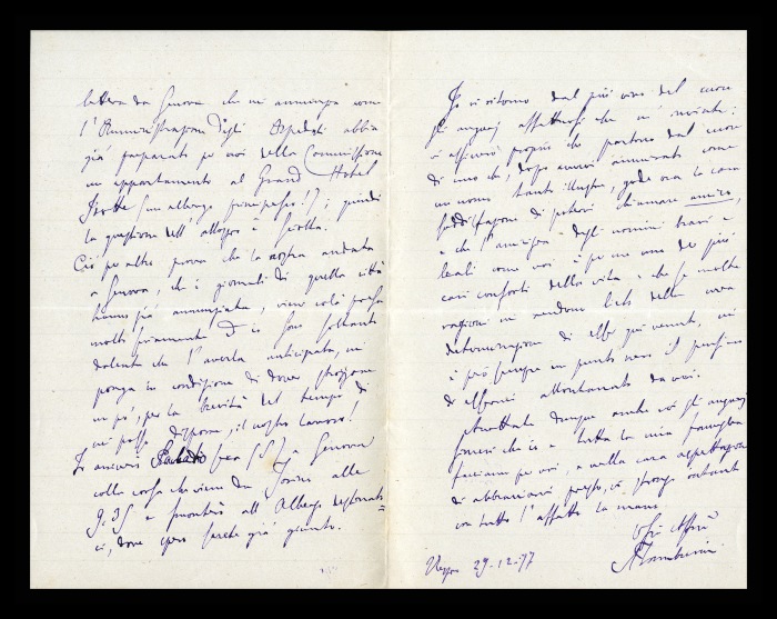 15) Reggio, 29.12.1877: Augusto Tamburini raccomanda a Biffi di non sorprendersi per l'esiguità del materiale che gli invia, a causa di alcuni ripensamenti sulla struttura del resoconto del Congresso di Aversa: gli propone di inserire le note anatomiche e la relazione di [Andrea] Verga sul “ganglio ottico”, prima della comunicazione di [Francesco] Vizioli. Spera di mandare tutto per la fine dell'anno. Ritiene opportuno che Rechiedei mandie al più presto le bozze di stampa di quanto inviato, dovendo partire il 3 gennaio per Torino. Informa Biffi che l'Amministrazione degli Ospedali [di Genova] ha predisposto per i membri della commissione d'inchiesta del manicomio una sistemazione nel principesco Grand Hotel Isotte. Lo informa dell'orario del suo arrivo in città verso le 9:35, sperando di trovarlo già lì. Ricambia gli auguri e i sentimenti d'amicizia, anche da parte della sua famiglia.
