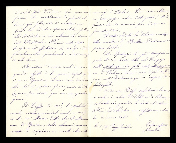 17) Reggio Emilia, 16.01.1878: Augusto Tamburini comunica a Biffi che, una volta rientrato da Genova, è stato colpito “da una forte nevralgia d'origine dentale”, che gli impedisce di fare qualunque cosa. Lo informa del contenuto della lettera di [Andrea] Verga, che corrisponde a quanto già deciso da Biffi e Tamburini stesso riguardo la stampa [del resoconto del Congresso di Aversa]. Condivide con Biffi il piacevole ricordo del soggiorno genovese ed esprime il suo desiderio di dedicarsi al più presto alla stesura della relazione, anche per avere l'occasioni di rivedere l'amico. Si lamenta per l'interpretazione data dal giornale “Il Caffaro” alle parole dei commissari. Esprime il proprio dolore per la morte di [Christian F.W.] Roller. Riferisce a Biffi che [Achille] Spatuzzi ha già fatto stampare a parte la sua memoria sullo stato dell'assistenza ai folli nell'Italia meridionale e pertanto non ritiene più necessario stamparla sull'“Archivio italiano per le malattie mentali”. Invia saluti anche da parte di [Cesare] Trebbi e di [Gaetano] Riva. Raccomanda di salutare “l'ottimo [Gaetano] Pini”.