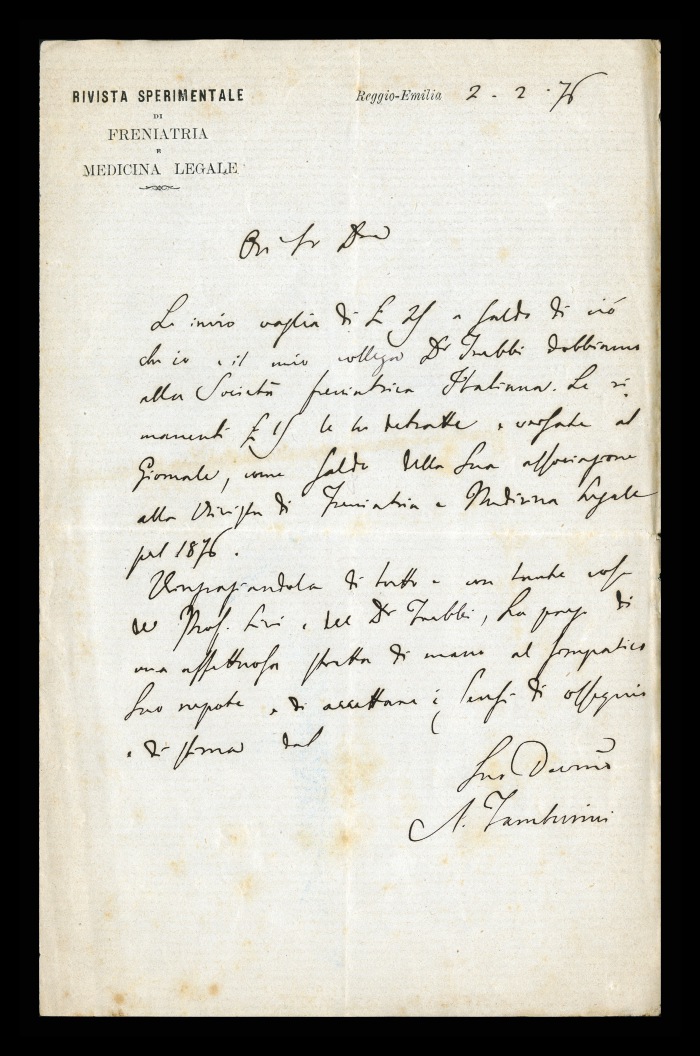 1) Reggio Emilia, 02.02.1876: Augusto Tamburini comunica a Biffi l'invio di un vaglia postale da parte sua e del suo collega [Cesare] Trebbi per la quota d'associazione alla Società italiana di freniatria, da cui ha detratto 15 lire, importo dell'abbonamento di Biffi alla “Rivista [sperimentale] di freniatria e medicina legale” per il 1876. Invia saluti anche da parte di Trebbi e di [Carlo] Livi.