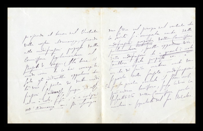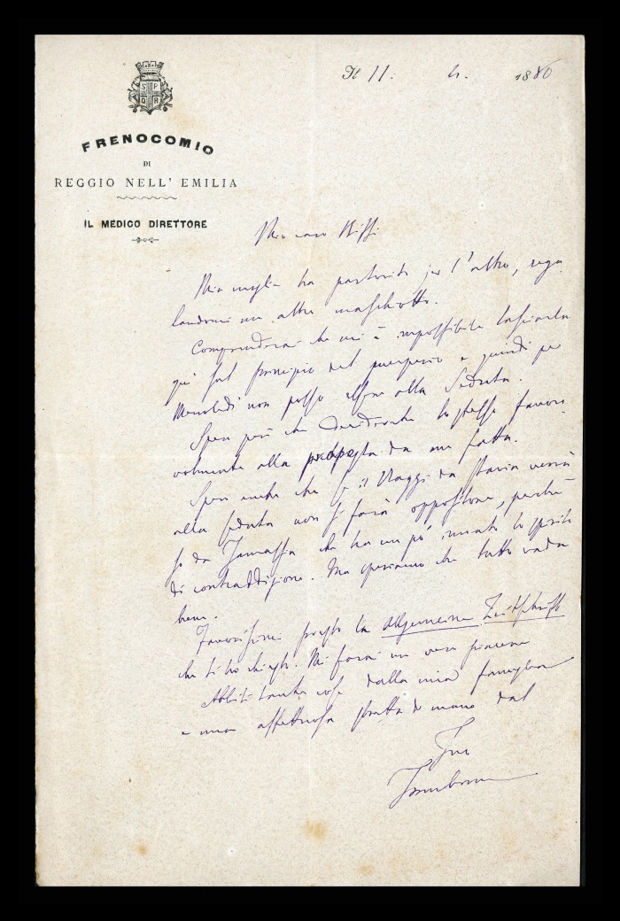 24) [Reggio Emilia], 10.05.1878: Augusto Tamburini dichiara il proprio imbarazzo per il ritardo nella stesura della relazione [per la riforma del manicomio di Genova], che causa difficoltà anche agli altri commissari, Biffi e [Gaetano] Pini. Si giustifica raccontando i numerosi e imprescindibili impegni al manicomio e all'università, promettendo che cercherà di finire il testo al più presto. Confida che Biffi e Pini riescano anche, con il loro “criterio ed acume” a renderla “più presentabile. Esprime preoccupazione per Riva (?) avendo notato in lui “un fondo di delirio d'orgoglio e di ottusità del senso morale”.