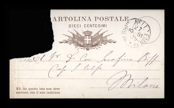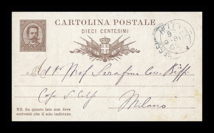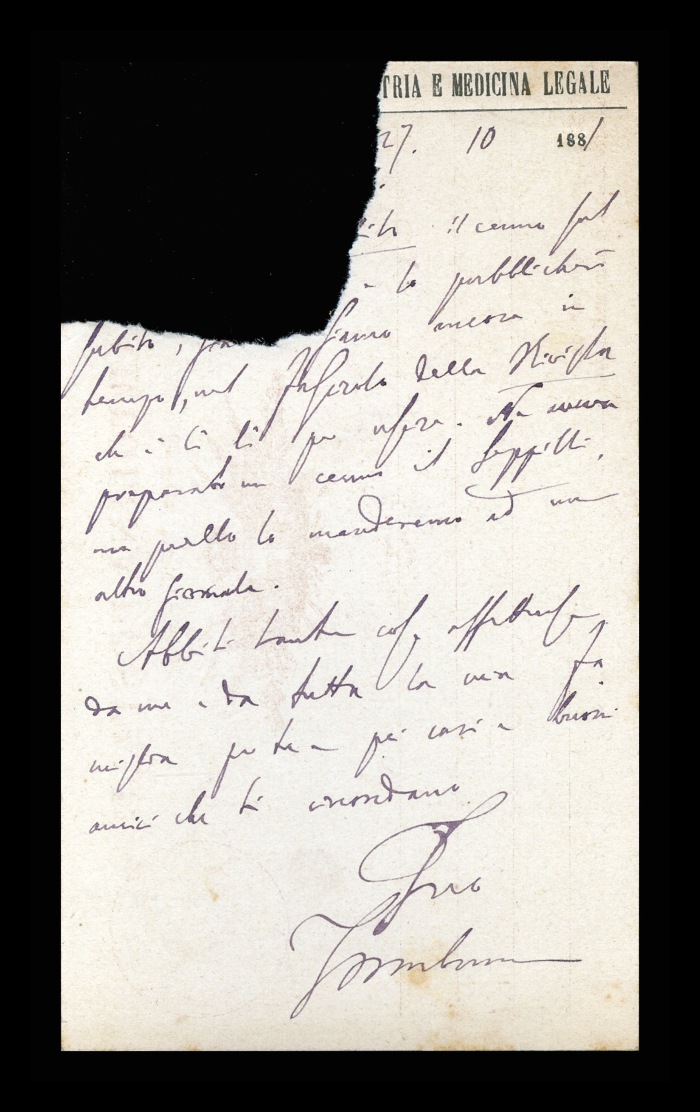 Carta intestata: RIVISTA SPERIMENTALE DI FRENIATRIA E MEDICINA LEGALE (cartolina postale lacerata, nella parte che specificava l'oggetto dello scritto)