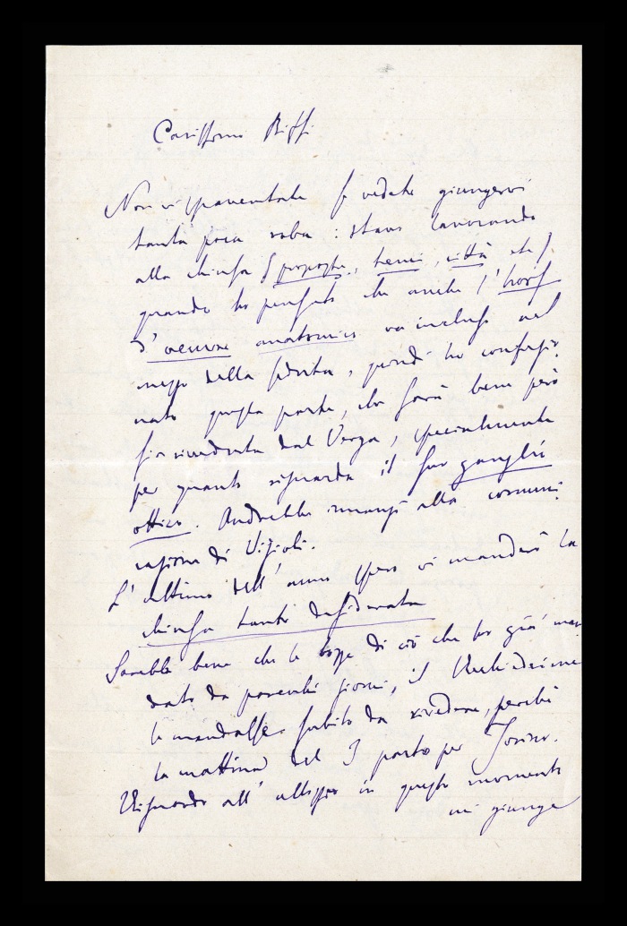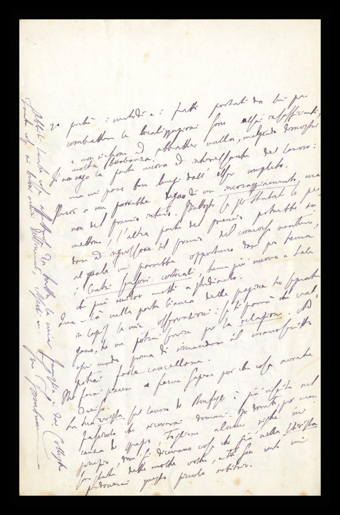37) [Reggio Emilia], 09.11.1881: Augusto Tamburini riferisce a Biffi di avergli rispedito il manoscritto “sui centri motori [della corteccia cerebrale]”, esponendone i pregi e soprattutto i difetti, che lo rendono a suo avviso un lavoro incompleto. Lo ritiene pertanto meritevole di un incoraggiamento, ma non dell'intero Premio [Fossati] messo in palio [dall'Istituto lombardo di scienze e lettere]. Propone di destinare la parte residua del premio al concorso dell'anno successivo. Comunica che la recensione di Biffi sul lavoro di [Clodomiro] Bonfigli è già stata stampata sul fascicolo che riceverà l'indomani, precisando di avere operato dei tagli per mancanza di spazio. Invia saluti da parte della famiglia e dei colleghi. Manda i suoi per [Angelo] De Vincenti ed Ascoli.