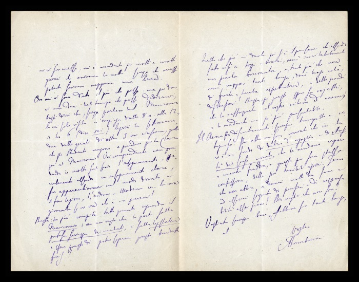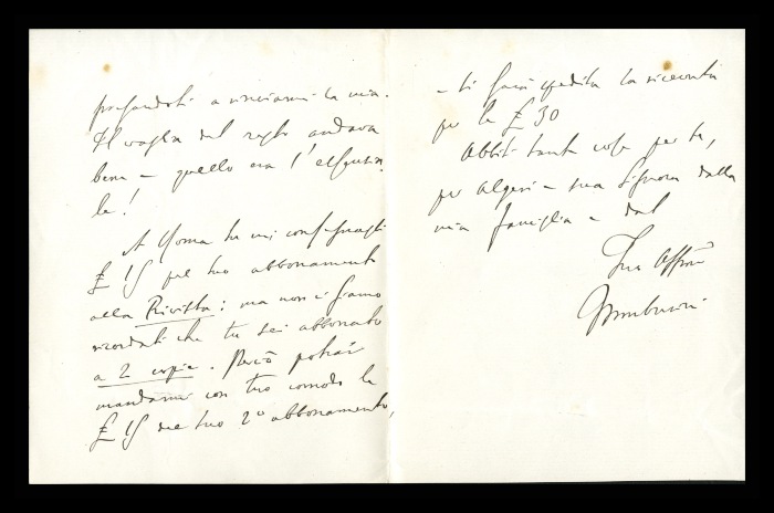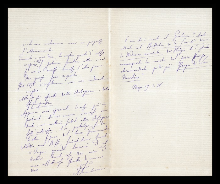 4) Pavia, 16.11.1876: Augusto Tamburini riconoscente a Biffi per quanto ha fatto in suo favore, auspica si presenti l'occasione per sdebitarsi. Lo ringrazia per aver contribuito a garantire la permanenza al suo fianco di [Francesco] Bergonzoli, “che conoscendo questi pazzi da 4 anni mi era indispensabile”. Invia saluti estesi ad [Andrea] Verga.