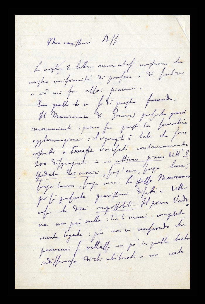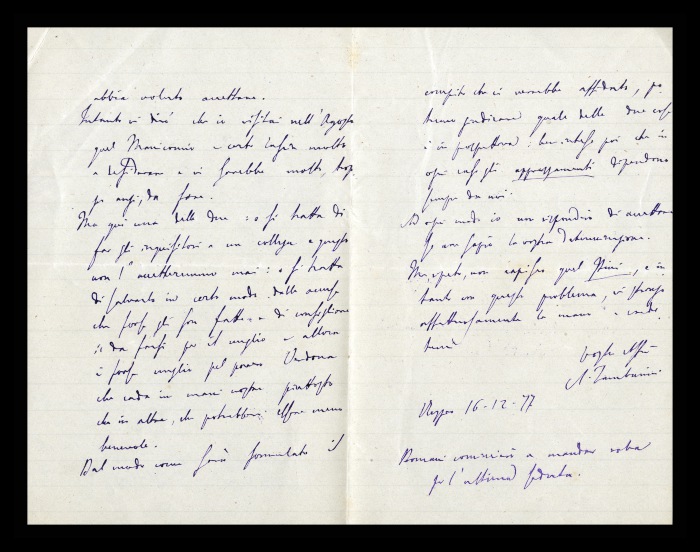 12) Reggio, 16.12.1877: Augusto Tamburini, nominato a far parte di una commissione d'inchiesta sul manicomio di Genova insieme a Biffi e a [Gaetano] Pini, si rammarica per la nomina di quest'ultimo e per l'esclusione di [Andrea] Verga. Comunica che accetterà solo se lo farà anche Biffi e si domanda se sia stato Verga a non volerci entrare. Riferisce di aver visitato l'istituto genovese nel mese di agosto, trovandoci “molto, troppo anzi, da fare”. Si interroga inoltre sull'atteggiamento da tenere, poiché non intende infatti essere inquisitore di un collega [Luigi Verdona], ma piuttosto fornirgli dei consigli e salvarlo. Aggiunge il prossimo invio di materiale [per il resoconto dell'ultima seduta del Congresso di Aversa].
