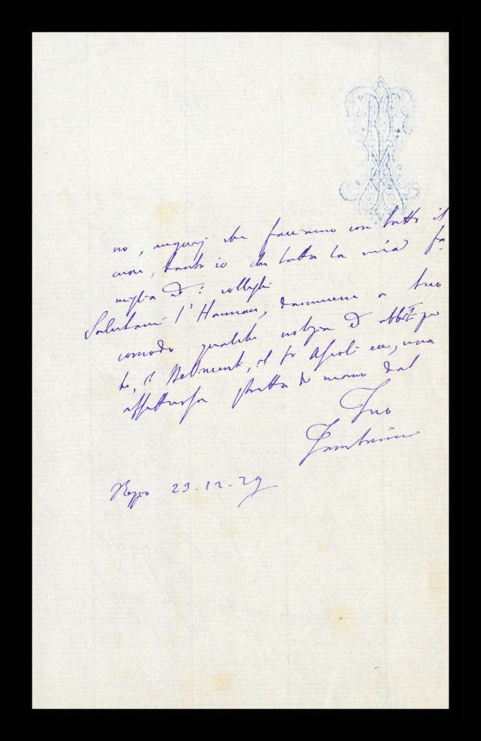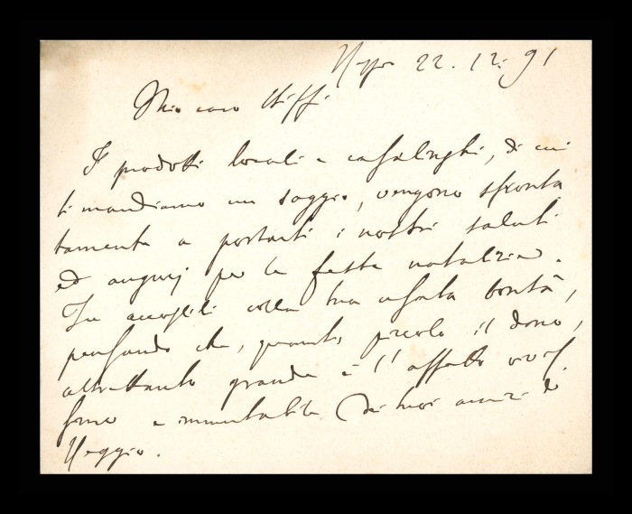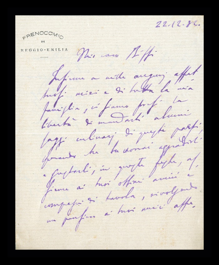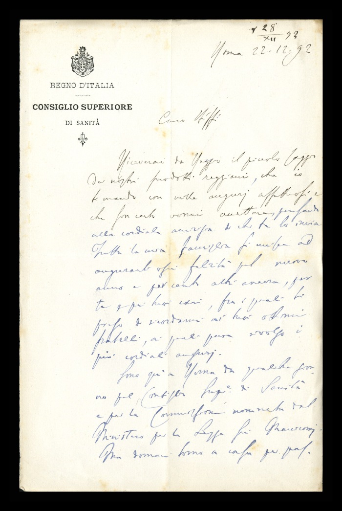 43) Roma, 22.12.1892: Augusto Tamburini manda a Biffi gli auguri per le prossime feste insieme ad un “piccolo saggio dei nostri prodotti reggiani”. Lo informa di trovarsi a Roma da alcuni giorni per impegni al Consiglio superiore di sanità e in seno alla Commissione per la Legge [sulla tutela e custodia degli alienati], ma che farà rientro a casa il giorno successivo.