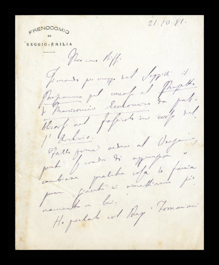 35) [Reggio Emilia], 21.10.1881:Augusto Tamburini comunica a Biffi che gli manderà tramite [Giuseppe] Seppilli il programma per il concorso al Progetto di manicomio economico, da pubblicare sul prossimo fascicolo dell' “Archivio [italiano per le malattie nervose]”. Chiede però di mostrarlo ad [Andrea] Verga prima di darlo alle stampe. Riferisce di avere parlato con il deputato [Giuseppe] Fornaciari in merito alla posizione della Società [freniatrica italiana] sulle modifiche proposte dalla commissione parlamentare al Progetto di Legge [Depretis sugli alienati e sui manicomi pubblici, privati e criminali, presentato alla Camera dei deputati il 15 marzo 1881]. Ringrazia Biffi anche da parte della moglie e della famiglia Luciani, per le cortesi ricevute durante il soggiorno a Milano. Invia saluti estesi ad [Angelo] De Vincenti e ad Ascoli.