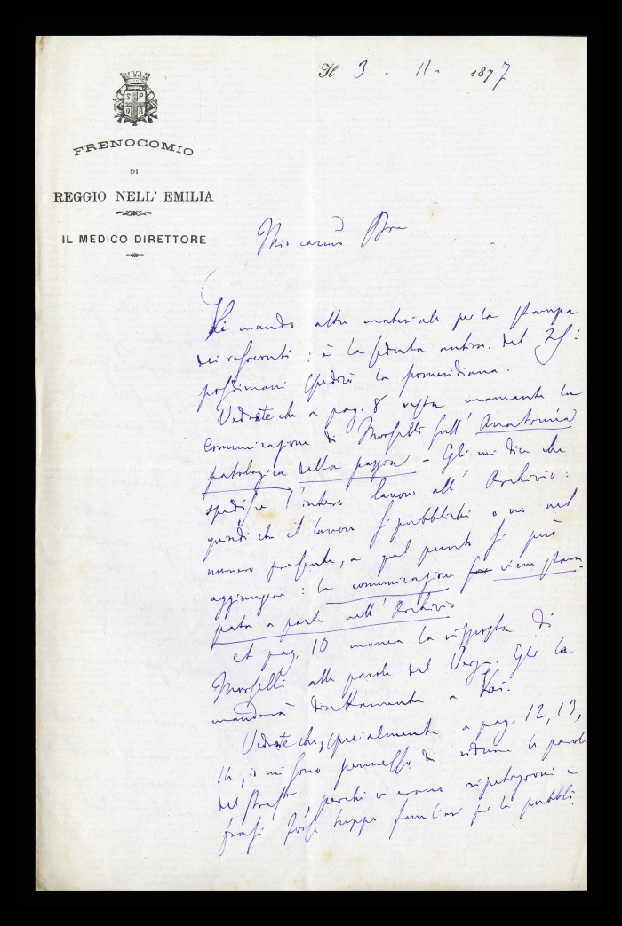 11) [Reggio Emilia], 03.11.1877: Augusto Tamburini comunica a Biffi la spedizione di nuovi materiali per il resoconto [del Congresso di Aversa]: noterà la mancanza della relazione di [Enrico] Morselli, sull' “Anatomia patologica della pazzia” - che sarà stampata a parte sull' “Archivio italiano per le malattie nervose” - così come della risposta dello stesso Morselli a Verga, che Morselli invierà direttamente a Biffi. Lo informa di aver ritoccato alcune parole alle pagine 12-13-14, perché contenevano delle ripetizioni e delle espressioni troppo colloquiali, precisando tuttavia che le bozze verranno inviate ai singoli relatori, i quali potranno fare a loro volta delle correzioni. Ritiene che per Verga, possa pensarci direttamente Biffi, prima ancora di mandare il manoscritto allo stampatore. Suggerisce, che lo stampatore Rechiedei mandi direttamente le bozze agli oratori, inviando a lui solo le parti che non devono essere controllate da altri. Si augura che [Camillo] Golgi accetti di collaborare all' “Archivio [italiano per le malattie nervose]”, avendo già accettato di far parte della nuova redazione della “Rivista sperimentale di freniatria e medicina legale”. Ritiene che il lavoro di Morselli sull'anatomia patologica della pazzia costituisca “il primo effetto della fusione morale fra i due giornali fratelli”. Esprime la sua riconoscenza per Biffi e Verga. Invia ringraziamenti anche da parte della moglie e di [Cesare] Trebbi. Rimane in attesa della prima bozza della seduta inaugurale. Domanda l'indirizzo di [Fortunato] Giliforti, forse medico condotto a Civitella Marittima, per potergli spedire la lettera della Commissione sulle “Cause della pazzia” di cui fa parte.