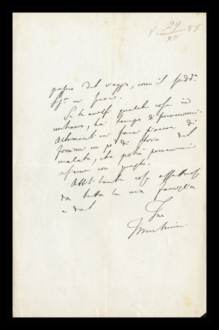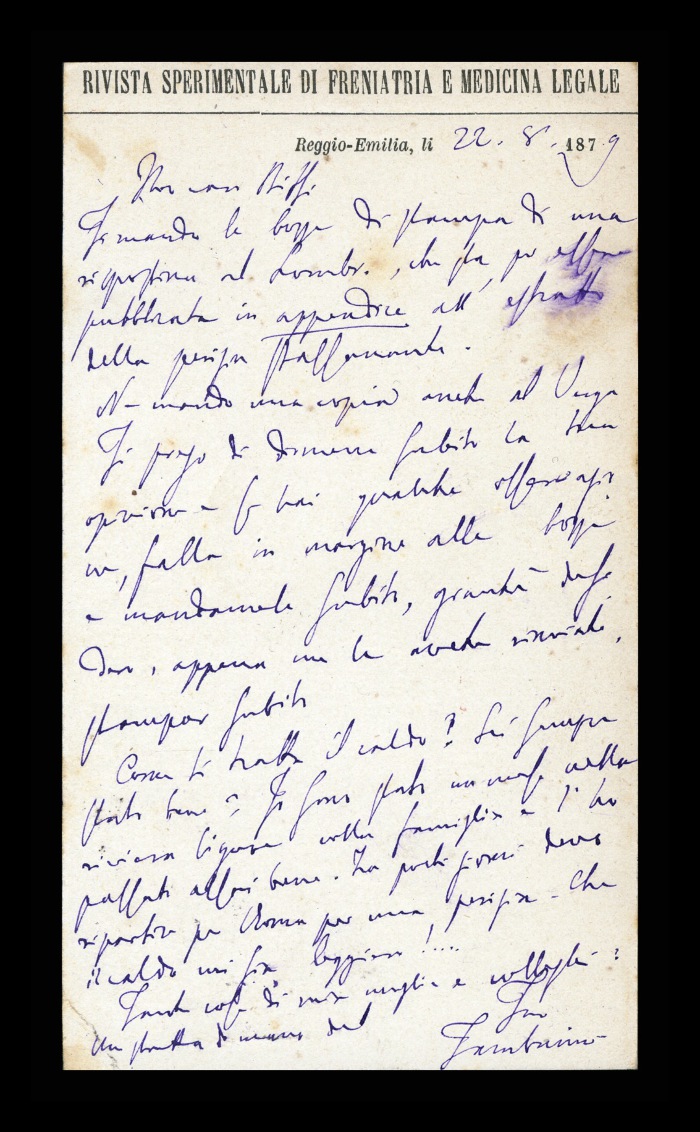 30) Reggio Emilia, 22.08.1879: Augusto Tamburini comunica a Biffi l'invio delle bozze di stampa di una risposta a [Cesare] Lombroso, che verrà pubblicata in appendice all'estratto della perizia Passannante. Lo prega di fare le sue osservazioni a margine del testo e lo informa di avere mandato copia del lavoro anche a Verga. Riferisce di essere rientrato da un soggiorno in Liguria e di essere in procinto di partire per Roma per una perizia.