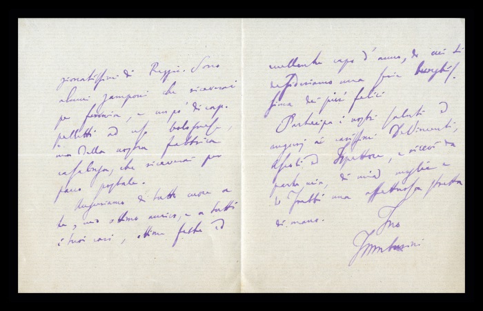 41) Reggio, 22.12.1891: Augusto Tamburini manda a Biffi gli auguri per le feste di Natale, accompagnandoli con qualche saggio di “prodotti locali e casalinghi”. Immagina l'eccitazione di [Giovanni] Algeri “pel suo gran passo” e per l'invito rivoltogli da Biffi in “codesto delizioso e pacato soggiorno”.