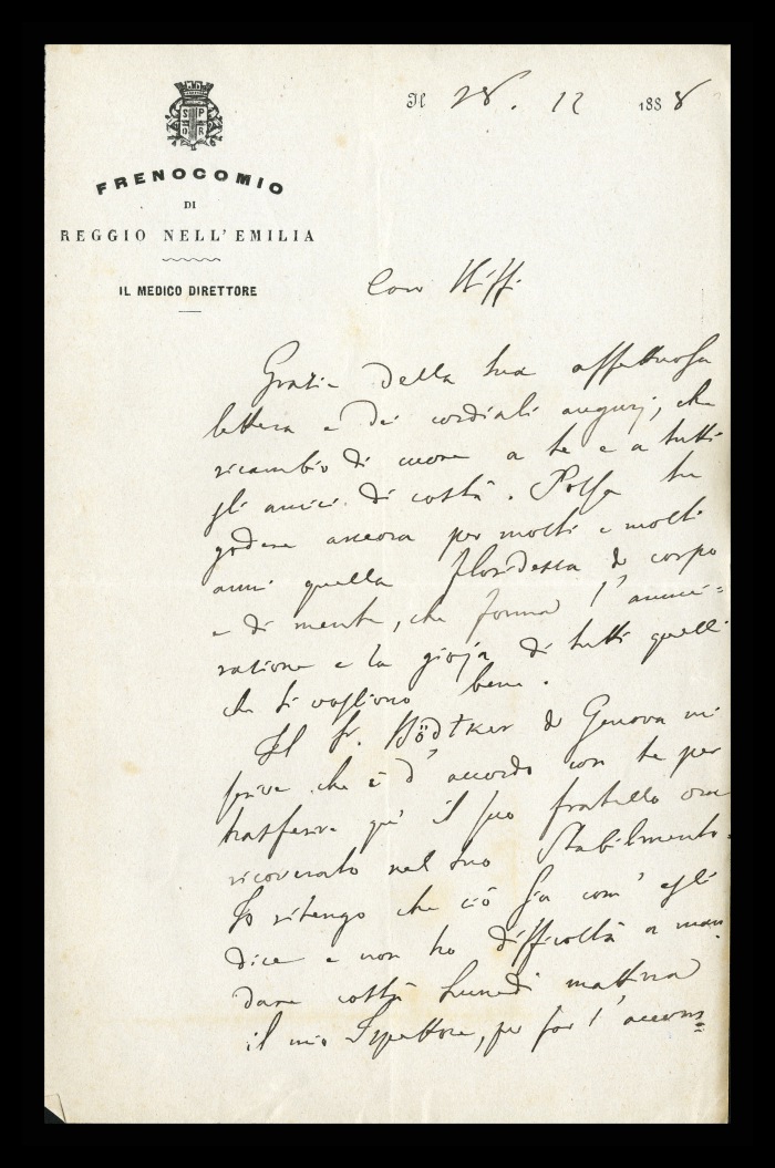 40) [Reggio Emilia], 28.12.1888: Augusto Tamburini ringrazia Biffi per la sua ultima lettera e ricambia gli auguri per le feste. Gli riferisce che il signor Bödtker di Genova si è detto d'accordo con Biffi per far trasferire suo fratello da Milano all'istituto di Reggio Emilia. Prega Biffi di confermargli il suo parere e di fargli avere anche qualche notizia del malato.