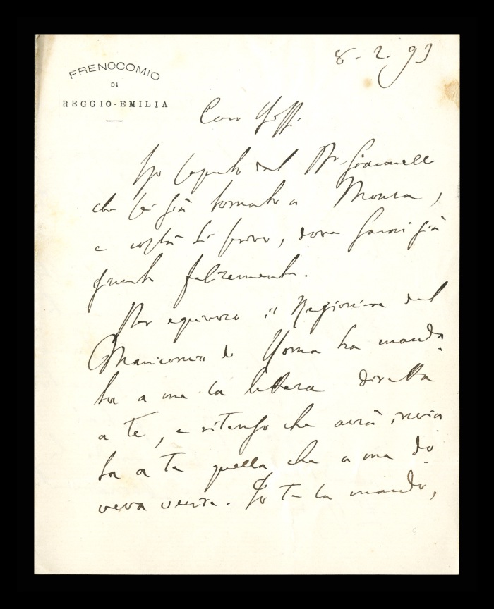 44) Reggio Emilia, 08.02.1893: Augusto Tamburini riferisce a Biffi di aver saputo da Giovanelli del suo rientro a Monza. Lo informa di essersi accorto che il ragioniere del manicomio di Roma ha invertito le lettere che dovevano essere loro indirizzate. Chiede a Biffi il pagamento del secondo abbonamento alla “Rivista sperimentale di freniatria e medicina legale”, perché a Roma entrambi non si sono ricordati che Biffi ha sottoscritto due abbonamenti. Invia saluti estesi a [Giovanni] Algeri e alla sua famiglia.