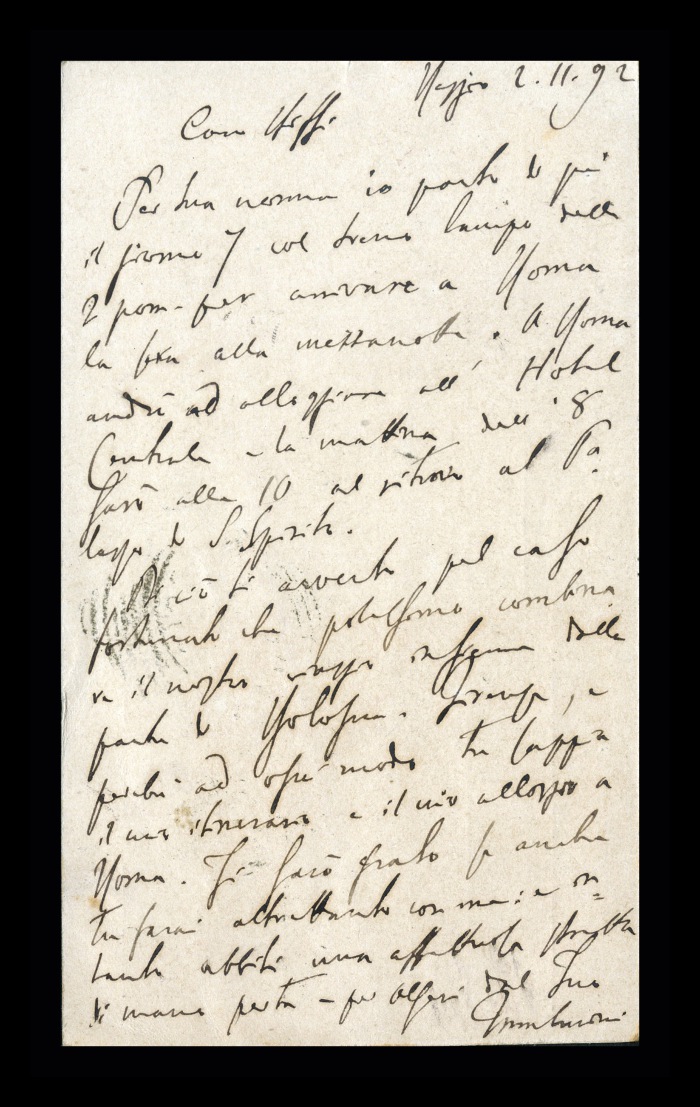 42) Reggio, 02.11.1892: Augusto Tamburini informa Biffi sul suo programma di viaggio: partirà la mattina del 7 per arrivare a Roma verso mezzanotte. Alloggerà all'Hotel Centrale e la mattina successiva si recherà al Palazzo di Santo Spirito. Si augura di poter combinare il viaggio insieme da Bologna. Chiede a Biffi di fargli sapere le sue intenzioni.