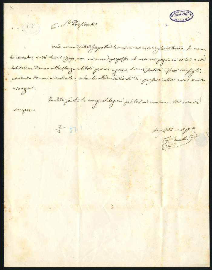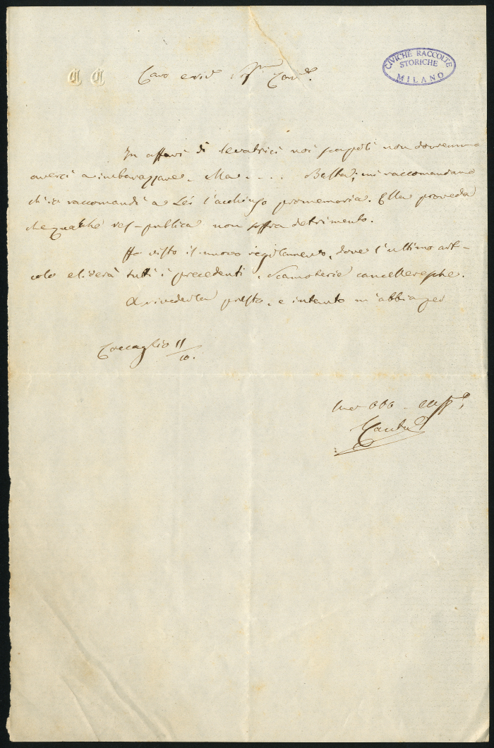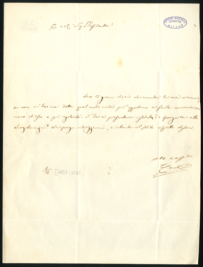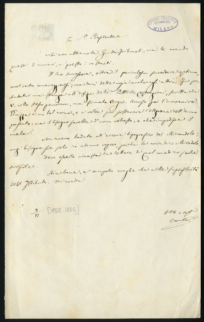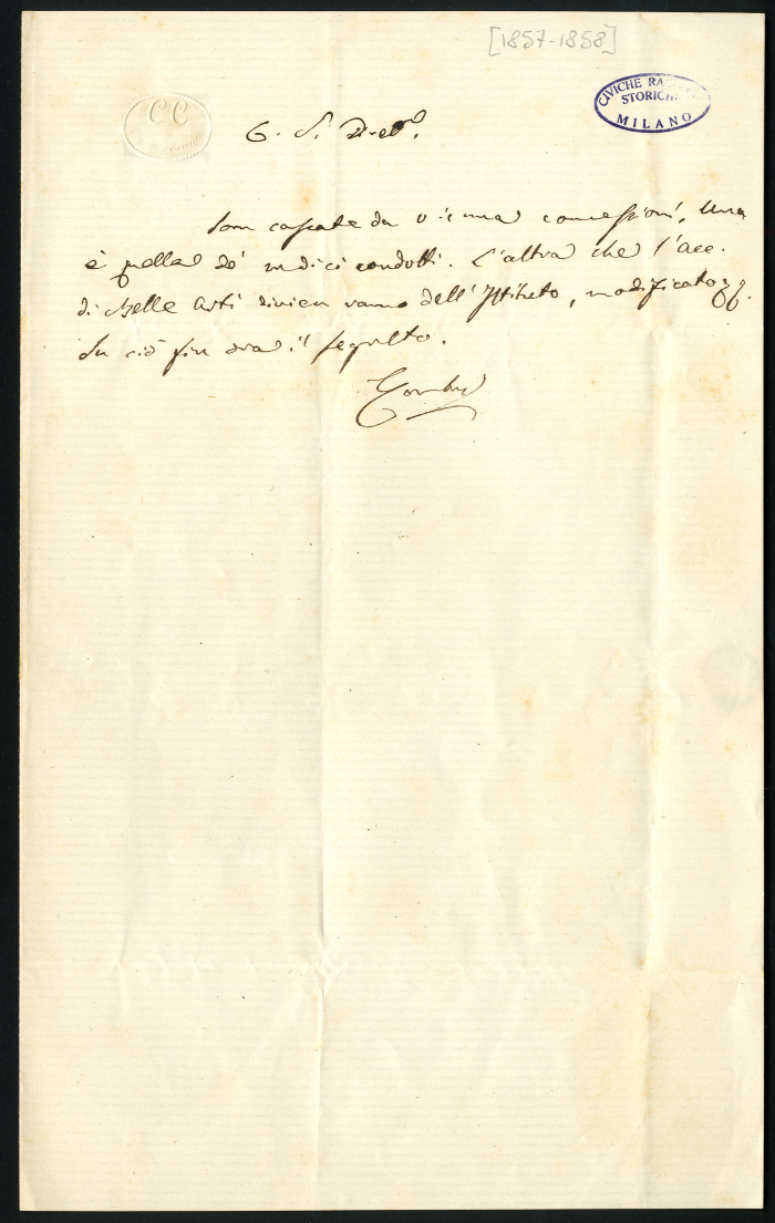 34) Carta intestata "CC / Perseverando". La lettera è indirizzata a Verga presidente [dell'Istituto lombardo] pertanto è stata attribuita agli anni 1857-1858.