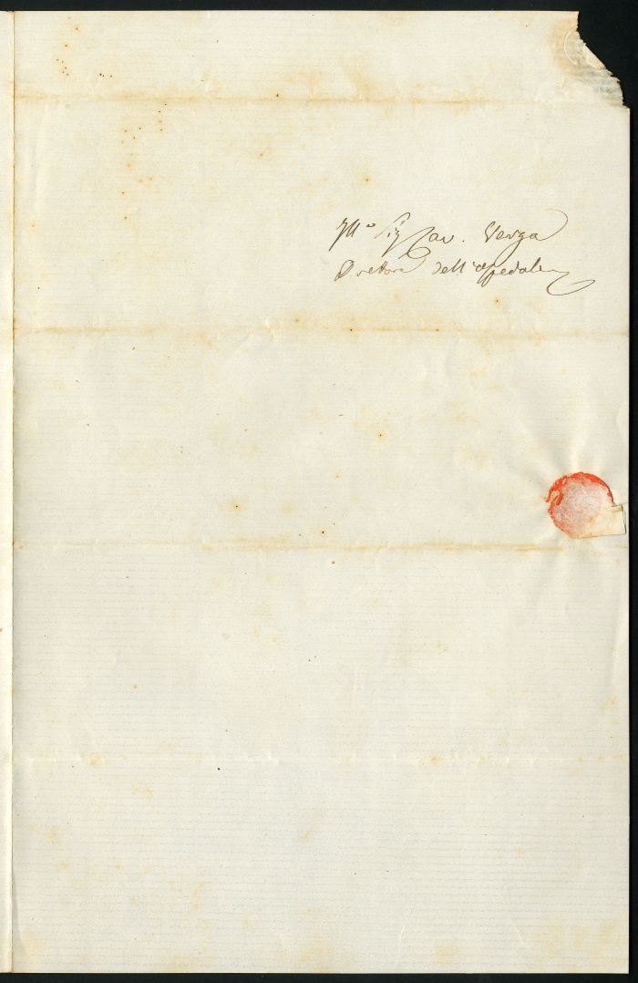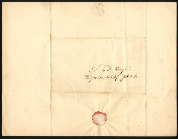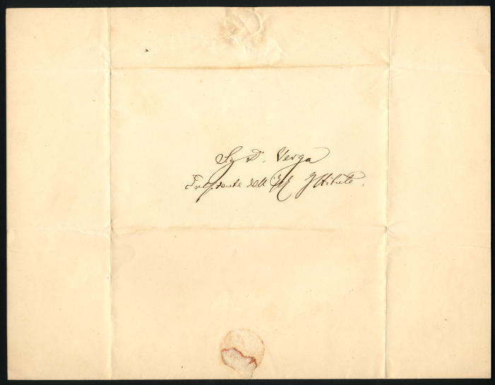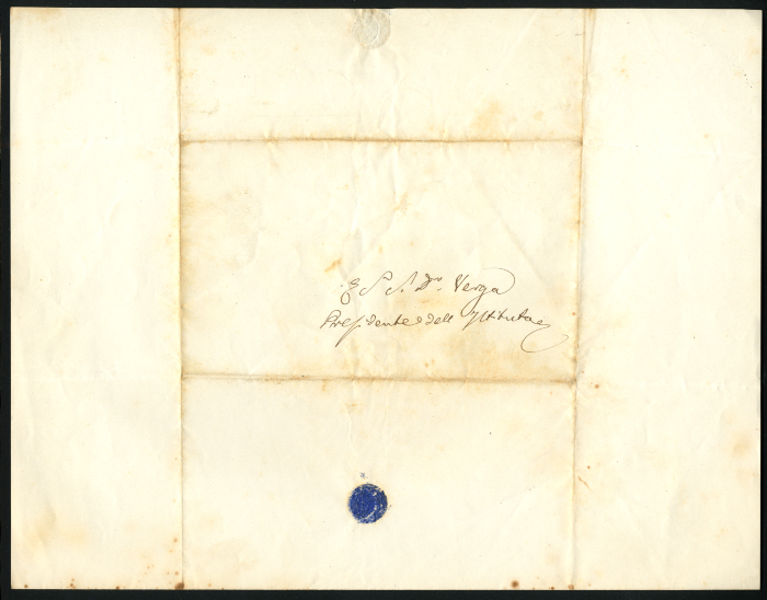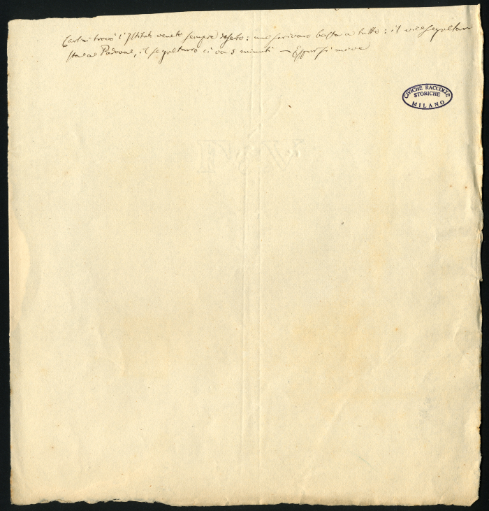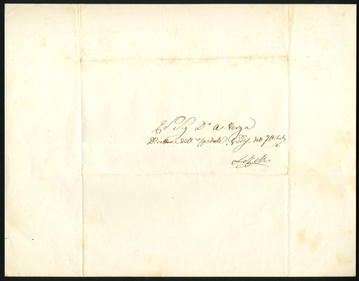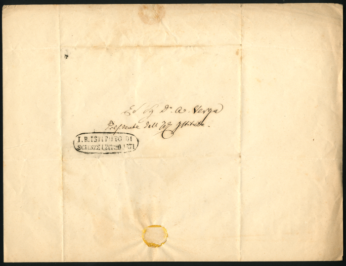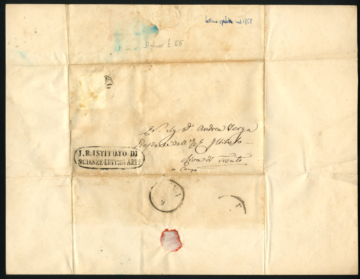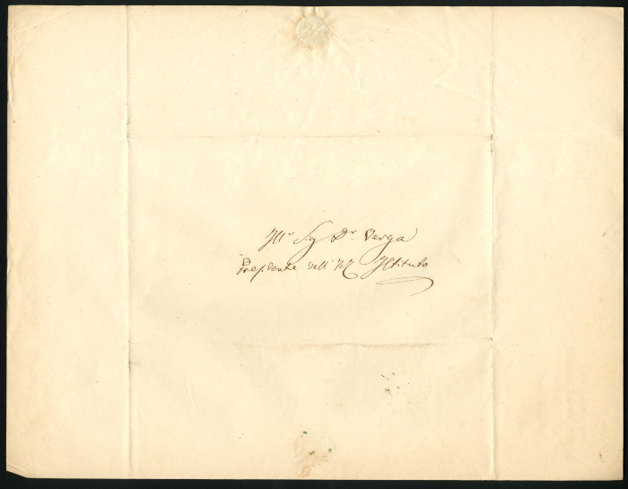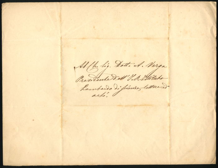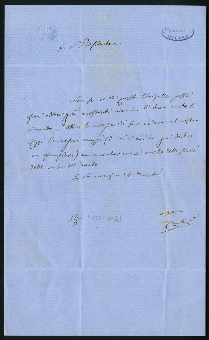 39) [s. l.], 12 settembre [1857-1865]: Manda a Verga alcuni libri sulla peste e gli chiede di mostrare a Rizzi l'allegata mappa "unicamente come anello della serie delle carte del Ducato".
