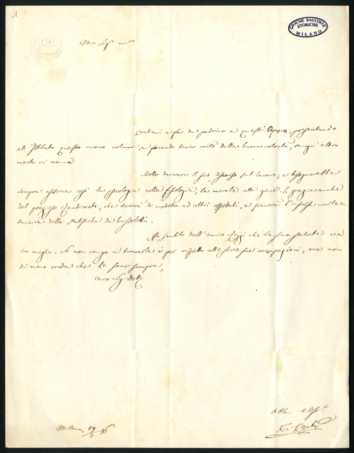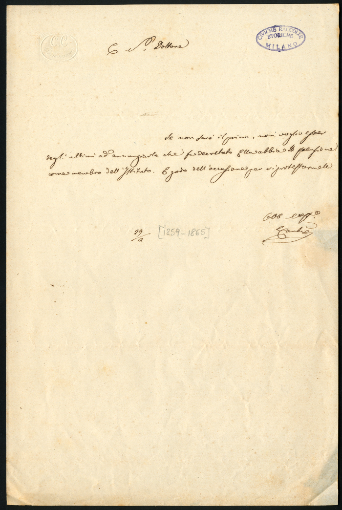 38) Carta intestata "CC / Perseverando". La lettera è indirizzata a Verga presidente [dell'Istituto lombardo] pertanto è attribuibile sia agli anni 1857-1858 che agli anni 1864-1865.