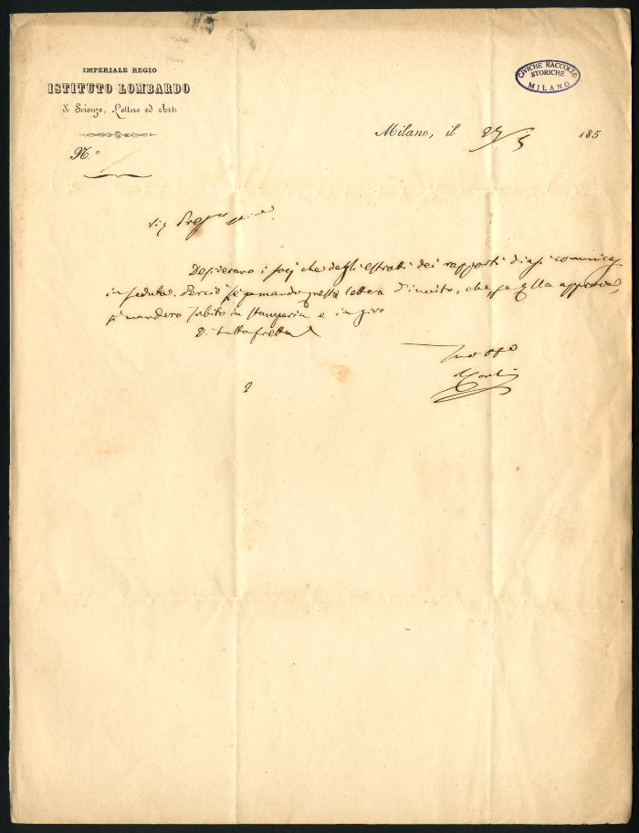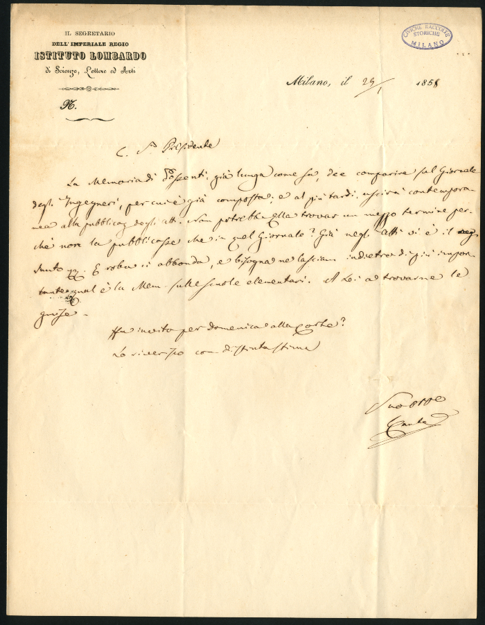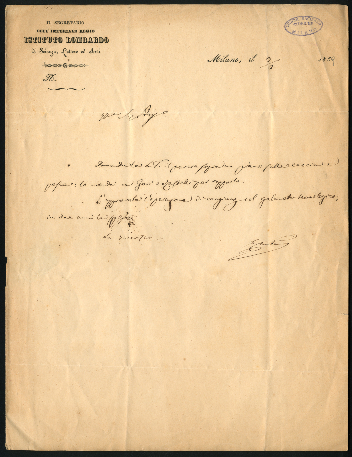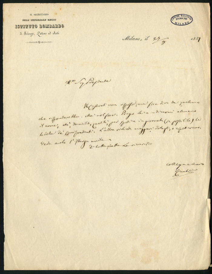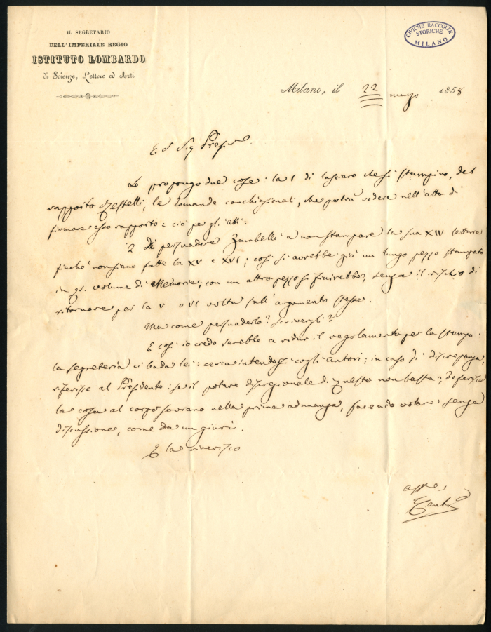 11) Carta intestata "Il segretario / dell'Imperiale regio / Istituto lombardo / di scienze, lettere ed arti". Non sono presenti allegati.